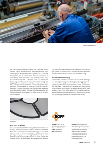 BEST OF Stadt Z%u00fcrich 49BEST OF Portrait xxx 2Adresse: G. BOPP + Co. AGBachmannweg 21, 8046 Z%u00fcrichTelefon: +41 44 377 66 66E-Mail: info@bopp.chWeb: www.bopp.comIn K%u00fcrze: Die hochmodernen Feinmetall-Gewebe der BOPP AG fi nden in verschiedensten Bereichen Anwendung: Sie fi ltern, sieben und schirmen ab. Dabei sorgen sie f%u00fcr kristallklares Trinkwasser, effektiven Blitzschutz in Windr%u00e4dern und Flugzeugen und h%u00f6chste Hygienestandards in der Lebens mittelproduktion.Ein besonders dringliches Thema, das die BOPP AG adressiert, ist die Wasserfi ltration. Weltweit gelangen noch immer grosse Mengen Abwasser ungefi ltert in die Umwelt. Mikroplastik, das laut WWF jeder Mensch w%u00f6chentlich in einer Menge von f%u00fcnf Gramm %u2013 was etwa der Gr%u00f6sse einer Kreditkarte entspricht %u2013 aufnimmt, stellt eine erhebliche Belastung dar. Mit speziell entwickelten Filtern tr%u00e4gt die BOPP%u00a0AG dazu bei, Mikroplastik in Fl%u00fcssen, Kl%u00e4ranlagen oder direkt am Entstehungsort zu entfernen. Diese Filter werden bereits in L%u00e4ndern wie Italien, den USA und Kanada eingesetzt. Doch w%u00e4hrend die Schweiz hohe Standards bei der Wasserreinigung setzt, besteht in vielen anderen L%u00e4ndern Nachholbedarf.und die langfristige Innovationskraft der Firma. Entscheidungen werden nicht klassisch von einer Einzelperson getroffen, sondern demokratisch innerhalb der Gesch%u00e4ftsleitung.Zukunft mit VerantwortungDie BOPP AG verbindet Tradition mit modernster Technologie und leistet gleichzeitig einen Beitrag zur L%u00f6sung globaler Herausforderungen. Ob in der Umwelttechnik, der Medizin oder der Raumfahrt %u2013 das Unternehmen zeigt, wie technisches Know-how aus einer kleinen Schweizer Gemeinde die Welt ver%u00e4ndern kann. Ihre Vision ist klar: Mit Innovation und Engagement die Lebensqualit%u00e4t verbessern, Ressourcen schonen und nachhaltige L%u00f6sungen f%u00fcr die Industrie schaffen.Arbeit an der WebmaschineEine Firma im WandelDie Geschichte der BOPP AG ist eng mit der Familie Bopp verbunden, die das Unternehmen %u00fcber vier Generationen f%u00fchrte. Nach dem Tod des letzten Inhabers Peter Bopp vor eineinhalb Jahren, wurde die Firma in eine Stiftung %u00fcberf%u00fchrt: die Peter Bopp Stiftung f%u00fcr Forschung und Technik. Diese einzigartige Struktur sichert die Weitergabe des gesammelten Wissens Wasserfi lter