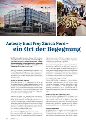 152 BEST OF BEST OF Portrait xxx Stadt Z%u00fcrichAutocity Emil Frey Z%u00fcrich Nord %u2013 ein Ort der BegegnungStell dir vor, du betrittst einen Ort, der nicht nur Autos verkauft, sondern auch Menschen zusammenbringt. Ein Ort, an dem du nicht nur dein Traumauto fi ndest, sondern auch unvergessliche Erlebnisse sammelst. Willkommen in der Autocity Emil Frey Z%u00fcrich Nord %u2013 einem Ort, der seit 1983 f%u00fcr Qualit%u00e4t und Innovation steht.Seit dem Neubau des Geb%u00e4udes ist die Autocity zu einer echten Begegnungsst%u00e4tte geworden. Hier treffen sich nicht nur Autoliebhaber:innen, sondern auch Kulturfreunde, Feinschmecker:innen und alle, die das Leben in vollen Z%u00fcgen geniessen wollen.Ein Ort, der Menschen verbindetSchon beim Betreten f%u00e4llt die edle Rezeption auf, an der das gut gelaunte und freundliche Empfangspersonal Eintretende und Besuchende begr%u00fcsst. Doch das ist erst der Anfang. Die Autocity Emil Frey Z%u00fcrich Nord empf%u00e4ngt Dich mit offenen Armen und l%u00e4sst Dich immer wieder zur%u00fcckkommen %u2013 nicht nur wegen den Autos, sondern wegen der einzigartigen Atmosph%u00e4re und den vielf%u00e4ltigen Events.Die Vision von Walter Frey, dem Patron des Unternehmens, war es, einen Ort zu schaffen, der Menschen zusammenbringt und an dem Gemeinschaft erlebt wird. Unter der Leitung von Christof Reutlinger und seinem Team ist diese Vision Wirklichkeit geworden. Die Autocity Emil Frey Z%u00fcrich Nord ist nicht nur ein Treffpunkt f%u00fcr die Kundschaft, sondern auch f%u00fcr Menschen aus der ganzen Region. Ein Ort, an dem man sich trifft, austauscht und gemeinsam erlebt.Von Jazzabenden bis Kino: Hier ist immer was losGeniesse einen entspannten Jazzabend, w%u00e4hrend du in der Steinway Lounge von den Kl%u00e4ngen eines selbstspielenden Fl%u00fcgels verzaubert wirst. F%u00fcr Musikfans gibt es private Konzerte mit Stars wie Pegasus oder Candy Dulfer. Sogar Comedian Kaya Yanar ist schon hier aufgetreten.Doch das ist noch lange nicht alles. Geplant sind Kino- Abende mit zeitlosen Filmklassikern in gem%u00fctlicher Atmosph%u00e4re. Oder wie w%u00e4re es mit einem Kochevent im integrierten Kochstudio, geleitet von der bekannten K%u00f6chin und Influencerin Nadia Damaso? Und f%u00fcr alle Fans des britischen Starkochs Jamie Oliver %u2013 vielleicht gibt es bald einen j%u00e4hrlichen Event, der deine Geschmacksknospen zum Tanzen bringt.Speed Dating im Auto? Warum nicht!In der Autocity Emil Frey Z%u00fcrich Nord wird auch Speed Dating veranstaltet %u2013 selbstverst%u00e4ndlich im Auto. Du triffst in acht Minuten auf interessante Menschen, w%u00e4hrend du in einem stylischen Auto sitzt. Wenn die Zeit um ist, hupt es und du wechselst zum n%u00e4chsten Auto und zum n%u00e4chsten Date. Ein lustiger und ungew%u00f6hnlicher Abend, der immer f%u00fcr viel Spass sorgt.Die Autocity App: Dein Begleiter f%u00fcr EventsDamit du kein Event verpasst, gibt es die Autocity App. Hier fi ndest du alle Infos zu den neuesten Veranstaltungen und kannst direkt buchen %u2013 ob Kochkurse, Jazzabende, Thermomix- Workshops oder sogar Blutspende-Termine. Die App ist dein pers%u00f6nlicher Begleiter, um immer auf dem Laufenden zu bleiben und deine Freizeit aktiv zu gestalten.Ein Ort f%u00fcr alle Anl%u00e4sseDie R%u00e4umlichkeiten der Autocity sind nicht nur f%u00fcr %u00f6ffentliche Events konzipiert, sondern auch f%u00fcr private Feiern und Firmenanl%u00e4sse. Ob eine exklusive Gala, eine Geburtstagsfeier oder ein Firmenevent %u2013 hier wird jeder Anlass zu einem