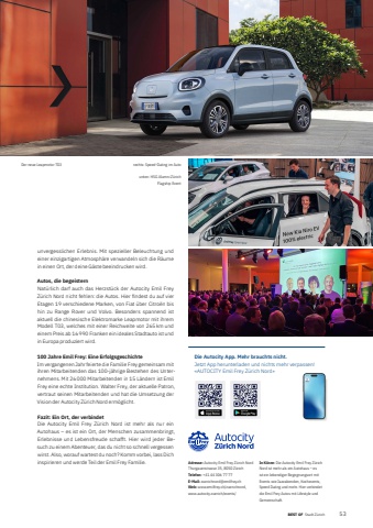 BEST OF Stadt Z%u00fcrich 53BEST OF Portrait xxx 2Adresse: Autocity Emil Frey Z%u00fcrich NordThurgauerstrasse 35, 8050 Z%u00fcrichTelefon: +41 44 306 77 77E-Mail: zuerichnord@emilfrey.chWeb: www.emilfrey.ch/zuerichnord, www.autocity.zuerich/events/In K%u00fcrze: Die Autocity Emil Frey Z%u00fcrich Nord ist mehr als ein Autohaus %u2013 es ist ein lebendiger Begegnungsort mit Events wie Jazzabenden, Kochevents, Speed Dating und mehr. Hier verbindet die Emil Frey Autos mit Lifestyle und Gemeinschaft.unvergesslichen Erlebnis. Mit spezieller Beleuchtung und einer einzigartigen Atmosph%u00e4re verwandeln sich die R%u00e4ume in einen Ort, der deine G%u00e4ste beeindrucken wird.Autos, die begeisternNat%u00fcrlich darf auch das Herzst%u00fcck der Autocity Emil Frey Z%u00fcrich Nord nicht fehlen: die Autos. Hier fi ndest du auf vier Etagen 19 verschiedene Marken, von Fiat %u00fcber Citro%u00ebn bis hin zu Range Rover und Volvo. Besonders spannend ist aktuell die chinesische Elektromarke Leapmotor mit ihrem Modell T03, welches mit einer Reichweite von 265 km und einem Preis ab 16 990 Franken ein ideales Stadtauto ist und in Europa produziert wird.100 Jahre Emil Frey: Eine ErfolgsgeschichteIm vergangenen Jahr feierte die Familie Frey gemeinsam mit ihren Mitarbeitenden das 100-j%u00e4hrige Bestehen des Unternehmens. Mit 26 000 Mitarbeitenden in 15 L%u00e4ndern ist Emil Frey eine echte Institution. Walter Frey, der aktuelle Patron, vertraut seinen Mitarbeitenden und hat die Umsetzung der Vision der Autocity Z%u00fcrich Nord erm%u00f6glicht.Fazit: Ein Ort, der verbindetDie Autocity Emil Frey Z%u00fcrich Nord ist mehr als nur ein Autohaus %u2013 es ist ein Ort, der Menschen zusammenbringt, Erlebnisse und Lebensfreude schafft. Hier wird jeder Besuch zu einem Abenteuer, das du nicht so schnell vergessen wirst. Also, worauf wartest du noch? Komm vorbei, lass Dich inspirieren und werde Teil der Emil Frey Familie.Die Autocity App. Mehr brauchts nicht.Jetzt App herunterladen und nichts mehr verpassen!%u00abAUTOCITY Emil Frey Z%u00fcrich Nord%u00bbDer neue Leapmotor T03 rechts: Speed-Dating im Autounten: HSG Alumni Z%u00fcrich Flagship Event