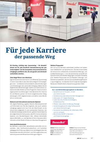 BEST OF BEST OF Stadt Z%u00fcrich 574F%u00fcr jede Karriere der passende WegAdresse: Benedict Schule Z%u00fcrichVulkanstrasse 106, 8048 Z%u00fcrichTelefon: +41 44 242 12 60E-Mail: info.zh@benedict.chWeb: www.benedict.chIn K%u00fcrze: Erfolg ist lernbar! Benedict bietet an zentralen Standorten in Z%u00fcrich, Luzern, Bern und St. Gallen ein spannendes Bildungsangebot mit anerkannten Abschl%u00fcssen an.Ob Einstieg, Aufstieg oder Quereinstieg %u2013 die Benedict Schule hat f%u00fcr jede berufliche Herausforderung das passende Angebot. Von den kompakten und praxisorientierten Lehrg%u00e4ngen profi tieren alle, die sich gezielt und individuell weiterbilden m%u00f6chten.Viele Wege f%u00fchren zum AbschlussEgal ob bessere Karrierechancen, ein effi zienter Quereinstieg in einen neuen Beruf oder alternative Wege f%u00fcr Schulabg%u00e4nger:innen %u2013 die Benedict Schule bietet f%u00fcr alle Anforderungen und Zielsetzungen den passenden Lehrgang. Neben berufsbegleitenden Weiterbildungen stehen auch Alternativen zur klassischen Berufslehre auf dem Programm. Diese schulisch organisierten Grundbildungen in den Bereichen KV, Informatik und Medizin werden mit einem eidgen%u00f6ssischen F%u00e4higkeitszeugnis (EFZ) abgeschlossen und stehen einer Berufslehre in nichts nach. National und international anerkannte DiplomeHR, Digital Marketing, Logistik, Medizin, Betriebswirtschaft und Informatik sind Teil des Angebots, das durch weitere Lehrg%u00e4nge erg%u00e4nzt wird. Auch bei den Abschl%u00fcssen ist die Schule breit aufgestellt. Zu den anerkannten Diplomen, die bei Benedict erlangt werden k%u00f6nnen, geh%u00f6ren Sprachdiplome, der eidgen%u00f6ssische Fachausweis, das EFZ, diverse Verbandsdiplome (z. B. B%u00fcrofachdiplom VSH, H%u00f6here Wirtschaftsdiplom VSK/HWD u. a.), der Bachelor of Arts in Business Administration und der Master of Science in Business Management.Hohe Qualit%u00e4tsstandardsBei Benedict unterrichten akkreditierte Lehrkr%u00e4fte mit Universit%u00e4ts- oder Fachhochschulabschluss und fundierter p%u00e4da gogischer Erfahrung. Neben ihrer Lehrt%u00e4tigkeit %u00fcben die Dozierenden beruflich eine Fach- und F%u00fchrungsfunktion aus, was eine praxisnahe Wissensvermittlung erm%u00f6glicht.Weitere PluspunkteWer sich an der Benedict weiterbildet, profi tiert von kostenlosen Wahlf%u00e4chern wie Sprachkursen. Dar%u00fcber hinaus bietet die Schule eine umfassende und kostenlose Bildungs- und Laufbahnberatung an, in der das pers%u00f6nliche Lernprofi l entsprechend den individuellen Neigungen und Zielen erarbeitet wird. Weitere Pluspunkte sind die flexiblen Zahlungs- und Darlehensmodalit%u00e4ten, die eine individuelle Bildungsfi nanzierung erm%u00f6glichen. Am Standort Z%u00fcrich sorgt das hauseigene Restaurant PIAZZA 106 f%u00fcr Abwechslung auf dem Teller.Aus- und Weiterbildungsangebote im %u00dcberblick%u2022 Sprachschule mit Gruppen-, Einzelund Online-Kursen%u2022 Handelsschule, Betriebswirtschaft, Management%u2022 Informatik, ICT, Digital Marketing %u2022 Cyber Security, K%u00fcnstliche Intelligenz, Entrepreneurship%u2022 Medizin, Gesundheit, Ern%u00e4hrung, Massage%u2022 Vorbereitungskurse f%u00fcr eidg. Fachausweise und h%u00f6here Fachpr%u00fcfungen%u2022 Schulische Grundbildung (KV, Informatik, MPA) und 10. Schuljahr%u2022 Berufsmaturit%u00e4t BM 2, Bachelorund Masterstudieng%u00e4nge