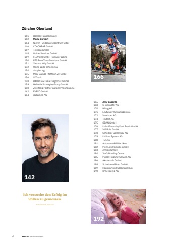 4 BEST OF InhaltsverzeichnisZ%u00fcrcher Oberland141 Bassler HausTechCare142 Manu Burkart144 Nieren- und Dialysezentrum Uster146 COACHBAR GmbH147 Tinybau GmbH148 Unitas Services GmbH149 FLOVINO GmbH | Schuler Weine150 PTS Pure Trust Solutions GmbH151 Yes and Why GmbH152 World Wide Wheels AG154 akuplex ag155 MKU Garage Pf%u00e4ffikon ZH GmbH156 V-Tronic158 BAUMGARTNER Diagfocus GmbH159 Helvetia Strategies Group GmbH160 Zweifel & Partner Garage Pneuhaus AG162 EVEVO GmbH164 dabamed AG166 Amy Baserga168 C. Schl%u00e4pfer AG170 Hiltag AG171 Leutwyler K%u00fchlanlagen AG172 Interkran AG174 Textest AG175 ODAN GmbH176 Licht&Strom by Dani Brack GmbH177 IvP Bohr GmbH178 Scheibler Gartenbau AG179 Lithium System AG180 TEA AG181 Autorama AG Wetzikon182 MeinElektromobil GmbH183 Amkon GmbH184 Joe%u2019s Bowling Center185 M%u00fcller Heizung-Service AG186 Akrotea.ch GmbH188 Schreinerei Breu GmbH189 Hauswartung Goldglanz KLG190 KMS Racing AG192142Ich versuche den Erfolg im Stillen zu geniessen.Manu Burkart, Seite 142166