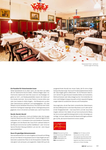 BEST OF Stadt Z%u00fcrich 59BEST OF Portrait xxx 2Adresse: Ristorante Casa FerlinStampfenbachstrasse 38, 8006 Z%u00fcrichTelefon: +41 44 362 35 09E-Mail: info@casaferlin.comWeb: www.casaferlin.chIn K%u00fcrze: Seit 117 Jahren und f%u00fcnf Generationen von Vater und Sohn %u00fcberzeugt das Casa Ferlin durch seine hochstehende italienische K%u00fcche und begeistert seine G%u00e4ste mit einer Atmosph%u00e4re wie im Herzen Venedigs. Ein Paradies f%u00fcr Feinschmecker:innenDiese Speisekarte ist es dann auch, die das Herz von allen, die die italienische K%u00fcche lieben, h%u00f6herschlagen l%u00e4sst. Authentische italienische Gerichte sowie ein reichhaltiges Angebot an Grill- und Steakspezialit%u00e4ten lassen die G%u00e4ste auf ihre Kosten kommen. Sei es das Filetto di manzo della casa oder das Costata di vitello Angelo %u2013 die Rezepturen wurden %u00fcber Generationen verfeinert und weitergegeben. %u00abF%u00fcr das Rezept unserer beliebten Mousse au Chocolat hat mein Vater bestimmt f%u00fcnfzigmal dasjenige seines Lieblingsrestaurants gegessen, bis er mit seinem zufrieden war%u00bb, lacht Franz Ferlin. Ravioli, Ravioli, RavioliDer Renner schlechthin sind und bleiben aber die hausgemachten Ravioli aus dem Hause Ferlin. Zweimal t%u00e4glich frisch zubereitet und in mindestens drei verschiedenen Varianten verf%u00fcgbar sind die Ravioli des Casa Ferlin weltweit bekannt. Die Ravioli sind mit einer sanften Kalbfleisch- oder mit einer Spinat-Ricotta-F%u00fcllung erh%u00e4ltlich und als Vor- oder Hauptspeise bestellbar. Raum f%u00fcr geselliges BeisammenseinDas variantenreiche A-la-carte-Angebot wird sowohl am Mittag als auch am Abend im Hauptsaal sowie im Sala Angelo serviert. Dank dem zus%u00e4tzlichen Platz ist die Atmosph%u00e4re in beiden R%u00e4umen gleich viel vertrauter und angenehm. Dabei hilft auch die ausgezeichnete Akustik des neuen Saals, die f%u00fcr eine ruhige Ger%u00e4uschkulisse sorgt. Doch auch frivolere G%u00e4stescharen heisst der Sala Angelo gerne willkommen. Ab 25 Personen l%u00e4sst er sich n%u00e4mlich f%u00fcr geschlossene Gesellschaften wie Hochzeiten, Weihnachtsessen oder Geburtstage buchen. Die mobile Bar mit einer reichhaltigen Grappa-Auswahl und der separate Eingang sorgen dabei f%u00fcr zus%u00e4tzlichen Genuss und Privatsph%u00e4re.Ganz egal also, ob als Paar beim romantischen Abendessen, als Gesch%u00e4ftspartner:innen beim Business Lunch oder als feiernde Festgesellschaft %u2013 das Casa Ferlin und der neue Sala Angelo nehmen ihre G%u00e4ste mit auf eine kulinarische Reise, bei der es einem gef%u00fchlsm%u00e4ssig direkt ins Herz Venedigs verschl%u00e4gt. Und wer dabei einmal die Ravioli all%u2019Angelo verk%u00f6stigen durfte, der kommt bestimmt immer wieder.Venezianische Pracht %u2013 die MuranoLeuchter sorgen f%u00fcr Stimmung.RistoranteCasadal 1907