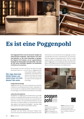 162 BEST OF BEST OF Portrait xxx Stadt Z%u00fcrichEs ist eine PoggenpohlAdresse:Poggenpohl K%u00fcchenstudio Z%u00fcrich Buckhauserstrasse 17, 8048 Z%u00fcrichTelefon: +41 44 215 44 88E-Mail: zuerich@poggenpohl.comWeb: www.zuerich.poggenpohl.comIn K%u00fcrze: Der Anspruch war und ist derselbe: K%u00fcchen besser zu machen. Als Erfi nder der modernen K%u00fcche verbindet Poggenpohl architektonisches Denken und Handeln mit Design und Pr%u00e4zision.Eine Poggenpohl K%u00fcche wird mit %u00e4usserster Sorgfalt und Aufmerksamkeit hergestellt. Jedes Element wird individuell gefertigt, um den hohen Massst%u00e4ben zu gen%u00fcgen. Das Ergebnis sind Produkte, die die vorgeschriebenen Standards f%u00fcr K%u00fcchenm%u00f6bel weit %u00fcbertreffen. Seit mehr als 130 Jahren entwickeln, gestalten und produzieren wir K%u00fcchen auf Luxusniveau. Die Feuerstelle. Der Herd. Die K%u00fcche. Wir haben eine lange Geschichte hinter uns %u2013 und noch viel vor. Poggenpohl baut nicht einfach K%u00fcchen, sondern schafft Raum. Einen Raum f%u00fcr Erlebnisse. Einen Raum f%u00fcr Freude. Raum f%u00fcr viele oder einen Einzelnen, Raum f%u00fcr Erinnerungen und Zuk%u00fcnftiges. Ausgezeichnetes Design Poggenpohl ruht sich nicht auf Innovationen aus, die die K%u00fcchenbranche nachhaltig beeinflusst haben. Stattdessen ist es unser Anspruch, neugierig zu bleiben, Bew%u00e4hrtes konstant zu hinterfragen und aus dem Guten das Beste zu entwickeln.Lassen Sie sich inspirieren Massgeblich f%u00fcr Poggenpohl sind die Menschen und ihre Bed%u00fcrfnisse, der gesellschaftliche Wandel und der Blick in die Zukunft. Es sind die kleinen Details, die unsere K%u00fcchen so besonders machen. Eine spannende Kombination aus warmem Holz und k%u00fchlem Metall, ein %u00fcberraschender Aufbewahrungsort, eine praktische Kleinigkeit %u2013 das alles sorgt daf%u00fcr, dass Sie sich sofort zu Hause f%u00fchlen werden. Poggenpohl K%u00fcchenstudio Z%u00fcrich Sie wollen sich %u00fcber K%u00fcchen informieren? Wollen Ihren Traum einer K%u00fcche verwirklichen? Dann besuchen Sie unser K%u00fcchenstudio. Dort erwartet Sie eine einzigartige und inspirierende Welt der K%u00fcchen. Premiumk%u00fcchen, die nach Ihren W%u00fcnschen geplant und gefertigt werden. K%u00fcchen in einzigartiger Qualit%u00e4t und individuellem Design. Das alles bietet Ihnen Poggenpohl. Ein kompetentes Team k%u00fcmmert sich eigens um Ihre Bed%u00fcrfnisse und setzt Ihre Tr%u00e4ume in die Realit%u00e4t um, damit Ihr K%u00fcchentraum zur Wahrheit wird.Wer sagt, dass eine K%u00fcche immer aussehen muss wie eine K%u00fcche? Wir nicht.