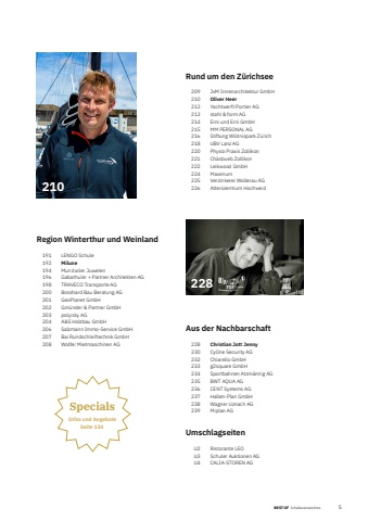 BEST OF Inhaltsverzeichnis 5228210Region Winterthur und Weinland191 LENGO Schule192 Milune194 Mundwiler Juwelen196 Gabathuler + Partner Architekten AG198 TRAVECO Transporte AG200 Bosshard Bau Beratung AG201 GeoPlanet GmbH202 Gm%u00fcnder & Partner GmbH203 polyroly AG204 A&S Holzbau GmbH206 Salzmann Immo-Service GmbH207 Bai Rundschleiftechnik GmbH208 Wolfer Mietmaschinen AGRund um den Z%u00fcrichsee209 JvM Innenarchitektur GmbH210 Oliver Heer212 Yachtwerft Portier AG213 stahl & form AG214 Erni und Erni GmbH215 MM PERSONAL AG216 Stiftung Wildnispark Z%u00fcrich218 UBV Lanz AG220 Physio Praxis Zollikon221 Ch%u00e4sbueb Zollikon222 Leikwood GmbH224 Mavenum225 Verzinkerei Wollerau AG226 Alterszentrum HochweidSpecialsInfos und AngeboteSeite 134Aus der Nachbarschaft228 Christian Jott Jenny230 CyOne Security AG232 Chiarello GmbH233 g2square GmbH234 Sportbahnen Atzm%u00e4nnig AG235 BWT AQUA AG236 CENT Systems AG237 Hallen-Plan GmbH238 Wagner Uznach AG239 Miplan AGUmschlagseitenU2 Ristorante LEOU3 Schuler Auktionen AGU4 CALIA-STOREN AG