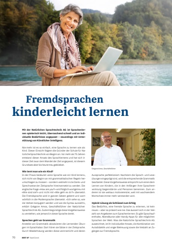70 BEST OF Stadt Z%u00fcrich 1 BEST OF Portrait xxx Fremdsprachen kinderleicht lernenMit der Nat%u00fcrlichen Sprachtechnik AG ist Sprachenlernen spielerisch leicht, %u00fcberraschend schnell und an individuelle Bed%u00fcrfnisse angepasst %u2013 neuerdings mit Unterst%u00fctzung von K%u00fcnstlicher Intelligenz.Nie mehr ist es so einfach, eine Sprache zu lernen wie als Kind. Dieser Einsicht folgten die Gr%u00fcnder der Schule f%u00fcr Nat%u00fcrliche Sprachtechnik von Beginn an. Vor mehr als 75 Jahren entstand dieser Ansatz des Sprachlernens und hat sich in dieser Zeit zwar dem Wandel der Zeit angepasst, ist diesem Grundsatz aber bis heute treu geblieben.Wie lernt man wie ein Kind?In der Praxis bedeutet %u00abeine Sprache wie ein Kind lernen%u00bb, sich nicht von Beginn an mit grammatikalischen Regeln herumschlagen zu m%u00fcssen %u2013 sondern vielmehr in die Denk- und Sprechweise der Zielsprache hineinversetzt zu werden. Die englische Frage %u00abHow are you?%u00bb wird folglich wortgetreu mit %u00abWie sind sie?%u00bb und nicht mit %u00abWie geht es dir?%u00bb %u00fcbersetzt. Die Fremdsprache wird in ganzen S%u00e4tzen gelernt und wortw%u00f6rtlich in die Muttersprache %u00fcbersetzt. %u00abIch sehe so, wie die Verben konjugiert werden und wie die Syntax aussieht%u00bb, erkl%u00e4rt Gr%u00e9goire Amos, Gesch%u00e4ftsf%u00fchrer der Nat%u00fcrlichen Sprachtechnik AG. Zudem beg%u00fcnstige diese Vorgehensweise zu verstehen, wie jemand in dieser Sprache denkt. Sprechen geht vor GrammatikAnstelle von Grammatik absolvieren die Lernenden %u00dcbungen im Sprachlabor. Dort h%u00f6ren sie S%u00e4tze in der Zielsprache. Durch Wiederholung werden diese verinnerlicht und deren Aussprache perfektioniert. Nachdem die Sprach- und Lese%u00fcbungen eingepr%u00e4gt sind, wird die entsprechende Grammatik bearbeitet. Diese Vorgehensweise entspricht zum einen dem Lernen von Kindern, die in den Anf%u00e4ngen ihrer Sprachentwicklung Gegenst%u00e4nde und Personen benennen. Zum anderen ist sie weitaus motivierender, weil mit wachsendem Wortschatz immer mehr verstanden wird.Hybrid-L%u00f6sung als Schl%u00fcssel zum ErfolgDas Bed%u00fcrfnis, eine fremde Sprache zu erlernen, ist kein neues %u2013 aber so pr%u00e4sent wie nie. Das %u00e4ussert sich in der Vielzahl von Angeboten zum Sprachenlernen. Es gibt Sprachaufenthalte, Abendkurse oder Handy-Apps f%u00fcr alle m%u00f6glichen Sprachen der Welt. Was die Nat%u00fcrliche Sprachtechnik AG auszeichnet, ist ihr individueller Ansatz, die Kombination von Autodidaktik und enger Betreuung sowie die Vielzahl an Zug%u00e4ngen zur Fremdsprache.Gr%u00e9goire Amos, Gesch%u00e4ftsf%u00fchrer