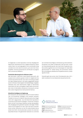 BEST OF BEST OF Stadt Z%u00fcrich Portrait xxx 712Adresse: Nat%u00fcrliche Sprachtechnik AGEsslingerstrasse 32, 8617 M%u00f6nchaltorfTelefon: +41 44 949 19 19E-Mail: info@sprachelernen.chWeb: www.sprachen-richtig-lernen.chIn K%u00fcrze: Die Nat%u00fcrliche Sprachtechnik AG bietet eine Vielzahl von Sprachlernprogrammen f%u00fcr unterschiedliche Sprachen an.Im Gegensatz zu einem Sprachkurs sind die Lehrg%u00e4nge der Nat%u00fcrlichen Sprachtechnik AG im eigenen Rhythmus absolvierbar. Wann und wie lange gelernt wird, entscheidet einzig und allein der Lerner oder die Lernerin, auch wenn Herr Amos empfi ehlt: %u00abDreimal w%u00f6chentlich f%u00fcr 30 Minuten ist pragmatisch und dennoch effi zient.%u00bb Pers%u00f6nliche Beratung durch erfahrene LehrerWer jetzt denkt, %u00abdass kann meine Sprach-App auch%u00bb, der verpasst einen weiteren grossen Vorteil im Angebot der Nat%u00fcrlichen Sprachtechnik AG. Auch wenn Lernende grunds%u00e4tzlich allein arbeiten k%u00f6nnen, sind stets ausgebildete Lehrpersonen im Einsatz. Sie korrigieren Schreibauftr%u00e4ge und geben Feedback dazu oder beantworten Fragen zu Wortschatz, Grammatik und dem Lernangebot. Dabei stehen die Lernenden immer mit derselben Lehrperson im Austausch und werden so %u00fcber die gesamte Lernzeit pers%u00f6nlich betreut.K%u00fcnstliche Intelligenz als Erg%u00e4nzungDer Aufwand f%u00fcr die Lehrpersonen hat sich mit dem Aufkommen von K%u00fcnstlicher Intelligenz nicht merklich reduziert. Trotzdem ist sie auch im Bereich Spracherwerb schon l%u00e4ngst nicht mehr wegzudenken. Auch die Nat%u00fcrliche Sprachtechnik AG baut auf K%u00fcnstliche Intelligenz. Zusammen mit Bryan Wirth von der Firma Impact Solutions wurden die bestehenden Lehrg%u00e4nge einem gr%u00f6sseren Update unterzogen. Mittlerweile sei das Programm so weit, dass man kaum zwischen einem echten Menschen und der KI unterscheiden k%u00f6nne, erkl%u00e4rt Herr Wirth. Die Studierenden wenden ihre erlernten Sprachkenntnisse in KI-generierten Szenarien an und erhalten in Echtzeit Vorschl%u00e4ge zur Verbesserung. Die k%u00fcnstlichen Situationen sind dabei so lebensnah, dass bei einer virtuellen Essensbestellung oder dem Kauf eines Flugtickets eine Nervosit%u00e4t ausgel%u00f6st wird, die mit derjenigen der realen Welt gleichzusetzen ist. %u00abDieser Stress, als Lernemotion, f%u00f6rdert den Lernerfolg aus didaktischer Perspektive extrem%u00bb, best%u00e4tigt Herr Amos. Stressfrei geht das Lernen einer Fremdsprache also nicht %u2013 daf%u00fcr kinderleicht mit der Nat%u00fcrlichen Sprachtechnik AG.
