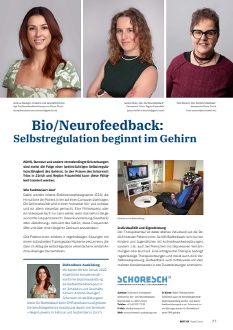 BEST OF BEST OF Stadt Z%u00fcrich Portrait xxx 771Adresse: Schoresch, Kompetenzzentrum f%u00fcr Bio- und NeurofeedbackBirchstrasse 11, 8057 Z%u00fcrichTelefon: +41 44 932 73 55E-Mail: info@schoresch.chWeb: www.schoresch-ausbildung.comIn K%u00fcrze: Nebst Therapie bietet Schoresch auch die berufsbegleitende Diplomausbildung als Bio- und Neurofeedbacktherapeut:in an. Schoresch ist als Bildungsanbieter f%u00fcr Biofeedback beim EMR gelistet.ADHS, Burnout und andere stressbedingte Erkrankungen sind meist die Folge einer beeintr%u00e4chtigen Selbstregulationsf%u00e4higkeit des Gehirns. In den Praxen des Schoresch Trios in Z%u00fcrich und Region Frauenfeld kann diese F%u00e4higkeit trainiert werden.Wie funktioniert das?Dabei werden mittels Elektroenzephalographie (EEG) die Hirnstr%u00f6me der Patient:innen auf einen Computer %u00fcbertragen. Die Gehirnaktivit%u00e4t wird in einer Animation h%u00f6r- und sichtbar und vor allem steuerbar gemacht: Eine Filmsequenz oder ein Videospiel l%u00e4uft nur dann weiter, wenn das Gehirn die gew%u00fcnschte Frequenz erreicht. Diese R%u00fcckmeldung (Feedback) oder %u00abBelohnung%u00bb motiviert das Gehirn, diese Frequenzen %u00f6fter und %u00fcber einen l%u00e4ngeren Zeitraum anzustreben.%u00abDie Patient:innen erleben in regelm%u00e4ssigen Sitzungen mit einem individuellen Trainingsplan Momente des Lernens, die dann im Alltag die Selbstregulation vereinfachen%u00bb, erkl%u00e4rt Andrina Roediger das Verfahren.Individualit%u00e4t und EigenleistungDer Therapieverlauf ist dabei ebenso individuell wie die Bed%u00fcrfnisse der Patient:innen. So hilft Biofeedback nicht nur bei Kindern und Jugendlichen mit Aufmerksamkeitsst%u00f6rungen, sondern z. B. auch bei Menschen mit depressiven Verstimmungen oder Burnout. Eine erfolgreiche Therapie bedingt regelm%u00e4ssige Therapiesitzungen und meist auch eine Verhaltensanpassung. Biofeedback wird mittlerweile von den meisten Krankenkassen in den Zusatzleistungen anerkannt.Ruth W%u00fcrsch, dipl. Bio/Neurofeedbacktherapeutin Praxis Z%u00fcrich(ruth.wuersch@schoresch.ch)Andrina Roediger, Inhaberin und Gesch%u00e4ftsf%u00fchrerin dipl. Bio/Neurofeedbacktherapeutin Praxis Z%u00fcrich(kompetenzzentrumschoresch@gmail.com)Sandra Keller, dipl. Bio/Neurofeedbacktherapeutin Praxis Region Frauenfeld(praxis.keller.schoresch@gmail.com)Biofeedback-AusbildungWir bieten die seit Januar 2022 eingef%u00fchrte komplement%u00e4rkonforme Diplomausbildung als Biofeedbacktherapeut:in an (Inhaberin und Gesch%u00e4ftsf%u00fchrerin Andrina Roediger). Schoresch ist als Bildungsanbieter f%u00fcr Biofeedback beim EMR anerkannt und gelistet. Die berufsbegleitende Ausbildung dauert vier Semester %u2013 Beginn jeweils im Februar und September in Z%u00fcrich.Einblick in die Behandlung Bio/Neurofeedback: Selbstregulation beginnt im Gehirn