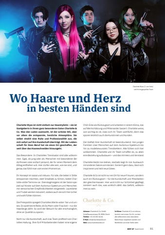 BEST OF BEST OF Stadt Z%u00fcrich Portrait xxx 81Wo Haare und Herz in besten H%u00e4nden sindCharlotte Wyss ist nicht einfach nur Haarstylistin %u2013 sie ist Gastgeberin in ihrem ganz besonderen Salon Charlotte & Co. Was den Laden ausmacht, ist der schicke Stil, aber vor allem die entspannte, herzliche Atmosph%u00e4re. Sie selbst strahlt eine Ruhe und Professionalit%u00e4t aus, die sich sofort auf ihre Kundschaft %u00fcbertr%u00e4gt. Mit der Leidenschaft f%u00fcr ihren Beruf hat sie einen Ort geschaffen, der weit %u00fcber das Haareschneiden hinausgeht.Das Besondere: In Charlottes Trendsalon sind alle willkommen. Egal, ob jung oder alt, Menschen mit besonderen Bed%u00fcrfnissen oder einfach jemand, der f%u00fcr einen Moment dem Alltag entfliehen will. Hier d%u00fcrfen alle sein, wie sie sind, und genau das f%u00fchlt man vom ersten Moment an.Ihr Konzept ist sozial und inklusiv. F%u00fcr alle, die lieber in Stille entspannen m%u00f6chten, statt Smalltalk zu f%u00fchren, bietet Charlotte %u00abstille Termine%u00bb an. Dienstagmorgens ist der Salon speziell auf Kinder auf dem Autismus-Spektrum und Menschen mit sensorischen Empfi ndlichkeiten eingestellt. Lautst%u00e4rke und Trubel werden reduziert, sodass auch sie sich hier sicher und wohl f%u00fchlen k%u00f6nnen.Die Preispolitik spiegelt Charlottes Werte wider: fair und unisex. Es spielt keine Rolle, ob Du Mann oder Frau bist %u2013 nur die Haarl%u00e4nge z%u00e4hlt. So wird der Besuch f%u00fcr alle erschwinglich, ohne an Qualit%u00e4t zu sparen.Nicht nur die Kundschaft, auch das Team profi tiert von Charlottes Haltung. Ihre f%u00fcnf Mitarbeitenden haben eine eigene Adresse: Charlotte & Co. GmbHSchaffhauserstrasse 30, 8006 Z%u00fcrichTelefon: +41 44 302 66 66E-Mail: info@charlotteandco.chWeb: www.charlotteandco.chIn K%u00fcrze: Charlotte & Co ist inklusiv, herzlich und unisex: Ein Ort, an dem alle willkommen sind, besondere Bed%u00fcrfnisse respektiert werden und Wohlf%u00fchlen an erster Stelle steht.Chill-Ecke als R%u00fcckzugsort und arbeiten in einem Klima, das auf Wertsch%u00e4tzung und Miteinander basiert. Charlotte weiss, wie wichtig es ist, dass sich ihr Team wohlf%u00fchlt, denn das sp%u00fcren letztlich auch die Kundinnen und Kunden.Die Vielfalt ihrer Kundschaft ist beeindruckend. Von jungen Familien %u00fcber Menschen auf dem Autismus-Spektrum bis hin zu modebewussten Trendsettern: Alle f%u00fchlen sich hier willkommen. Charlotte und ihr Team schaffen es, zu allen eine Beziehung aufzubauen %u2013 und das mit Herz und Verstand.Charlotte bleibt nie stehen, deshalb liegt ihr der Austausch mit anderen Salons am Herzen. Sie lernt gern dazu, l%u00e4sst sich inspirieren und teilt neue Ideen.Charlotte & Co ist nicht nur ein Ort f%u00fcr neue Frisuren, sondern auch ein R%u00fcckzugsort %u2013 f%u00fcr die Kundschaft und Mitarbeitenden gleichermassen. Hier wird nicht nur Sch%u00f6nheit gepflegt, sondern auch das, was wirklich z%u00e4hlt: das Gef%u00fchl, willkommen zu sein.Charlotte Wyss (2. von links) und ihr eingespieltes Team
