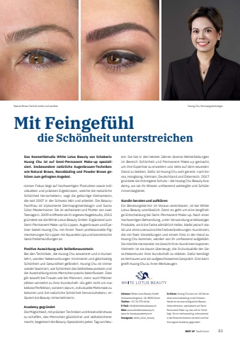 BEST OF Stadt Z%u00fcrich 83BEST OF Portrait xxx 1Mit Feingef%u00fchl die Sch%u00f6nheit unterstreichen Adresse: White Lotus Beauty GmbHSchwamendingenstr. 18, 8050 Z%u00fcrichTelefon: +41 76 370 66 66E-Mail: info@whitelotusbeauty.chWeb: www.whitelotusbeauty.ch, www.hc-beautyacademy.comInstagram: white_lotus_beautyIn K%u00fcrze: Huong Chu kam vor 18 Jahren ohne eine Ausbildung in die Schweiz. Heute ist sie eine erfolgreiche BeautyUnternehmerin, spezialisiert auf SemiPermanent Make-up, das voll im Trend liegt. Sie ist mehrsprachig, international in der Branche bestens vernetzt und hat ihre eigene Academy gegr%u00fcndet. Das Kosmetikstudio White Lotus Beauty von Inhaberin Huong Chu ist auf Semi-Permanent Make-up spezialisiert. Insbesondere nat%u00fcrliche Augenbrauen-Techniken wie Natural Brows, Nanoblading und Powder Brows geh%u00f6ren zum gefragten Angebot. %u00abUnser Fokus liegt auf hochwertigen Produkten sowie individuellen und pr%u00e4zisen Ergebnissen, welche die nat%u00fcrliche Sch%u00f6nheit hervorheben%u00bb, sagt die geb%u00fcrtige Vietnamesin, die seit 2007 in der Schweiz lebt und arbeitet. Die BeautyFachfrau ist diplomierte Dermapigmentologin und Swiss Color Mastertrainer. Sie ist verheiratet und Mutter von zwei Teenagern. 2009 er%u00f6ffnete sie ihr eigenes Nagelstudio, 2015 gr%u00fcndete sie die White Lotus Beauty GmbH. Erg%u00e4nzend zum Semi-Permanent Make-up f%u00fcr Lippen, Augenbrauen und Eyeliner bietet Huong Chu mit ihrem Team professionelle Pigmentierungen f%u00fcr Lippen mit Aquarelle Lips und kosmetische Gesichtsbehandlungen an. Positive Auswirkung aufs SelbstbewusstseinBei den Techniken, die Huong Chu anwendet und in Kursen lehrt, werden Nebenwirkungen minimieret und gleichzeitig Sch%u00f6nheit und Gesundheit gef%u00f6rdert. Huong Chu ist immer wieder fasziniert, wie Sch%u00f6nheit das Selbstbewusstsein und die Ausstrahlung eines Menschen positiv beeinflussen. Dies gilt sowohl bei Frauen wie bei M%u00e4nnern, denn auch M%u00e4nner z%u00e4hlen vermehrt zu ihrer Kundschaft. %u00abEs geht nicht um makellose Perfektion, sondern darum, individuelle Merkmale zu betonen und die nat%u00fcrliche Sch%u00f6nheit hervorzuheben%u00bb, erl%u00e4utert die Beauty-Unternehmerin.Academy gegr%u00fcndetDie M%u00f6glichkeit, mit pr%u00e4zisen Techniken und Kreativit%u00e4t etwas zu schaffen, das Menschen gl%u00fccklicher und selbstsicherer macht, begeistert die Beauty-Spezialistin jeden Tag von Neuem. Sie hat in den letzten Jahren diverse Weiterbildungen im Bereich Sch%u00f6nheit und Permanent Make-up gemacht, um ihre Expertise zu erweitern und stets auf dem neuesten Stand zu bleiben. Daf%u00fcr ist Huong Chu weit gereist: nach Korea, Hongkong, Vietnam, Deutschland und %u00d6sterreich. 2017 gr%u00fcndete sie ihre eigene Schule %u2013 die Huong Chu Beauty Academy, wo sie ihr Wissen umfassend weitergibt und Sch%u00fclerinnen begleitet. Kundin beraten und aufkl%u00e4renEin Beratungstermin im Voraus vereinbaren, ist bei White Lotus Beauty unerl%u00e4sslich. Denn es geht um eine langfristige Entscheidung bei Semi-Permanent Make-up. Nach einer hochwertigen Behandlung, unter Verwendung erstklassiger Produkte, wird die Farbe allm%u00e4hlich heller, bleibt jedoch stabil und ohne unerw%u00fcnschte Farbver%u00e4nderungen. Kundinnen, die mit fi xen Vorstellungen und einem Foto in der Hand zu Huong Chu kommen, werden von ihr umfassend aufgekl%u00e4rt. Sie m%u00f6chte niemanden ins Gesicht ihrer Kundinnen kopieren. Vielmehr ist sie davon %u00fcberzeugt, die Individualit%u00e4t der Gesichtskonturen ihrer Kundschaft zu st%u00e4rken. Daf%u00fcr ben%u00f6tigt es Vertrauen und ein aufgeschlossenes Gespr%u00e4ch. Erst dann greift Huong Chu zu ihren Werkzeugen. Natural Brows Technik vorher und nachher Huong Chu, Dermapigmentologin