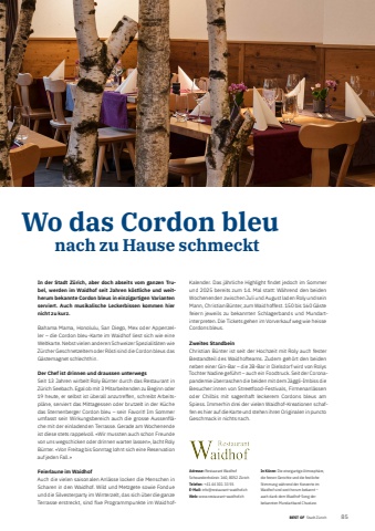 BEST OF BEST OF Stadt Z%u00fcrich Portrait xxx 851In der Stadt Z%u00fcrich, aber doch abseits vom ganzen Trubel, werden im Waidhof seit Jahren k%u00f6stliche und weitherum bekannte Cordon bleus in einzigartigen Varianten serviert. Auch musikalische Leckerbissen kommen hier nicht zu kurz.Bahama Mama, Honolulu, San Diego, Mex oder Appenzeller %u2013 die Cordon bleu-Karte im Waidhof liest sich wie eine Weltkarte. Nebst vielen anderen Schweizer Spezialit%u00e4ten wie Z%u00fcrcher Geschnetzeltem oder R%u00f6sti sind die Cordon bleus das G%u00e4stemagnet schlechthin. Der Chef ist drinnen und draussen unterwegsSeit 13 Jahren wirbelt Roly B%u00fcnter durch das Restaurant in Z%u00fcrich Seebach. Egal ob mit 3 Mitarbeitenden zu Beginn oder 19 heute, er selbst ist %u00fcberall anzutreffen, schreibt Arbeitspl%u00e4ne, serviert das Mittagessen oder brutzelt in der K%u00fcche das Sternenberger Cordon bleu %u2013 sein Favorit! Im Sommer umfasst sein Wirkungsbereich auch die grosse Aussenfl%u00e4che mit der einladenden Terrasse. Gerade am Wochenende ist diese stets rappelvoll. %u00abWir mussten auch schon Freunde von uns wegschicken oder drinnen warten lassen%u00bb, lacht Roly B%u00fcnter. %u00abVon Freitag bis Sonntag lohnt sich eine Reservation auf jeden Fall.%u00bbFeierlaune im WaidhofAuch die vielen saisonalen Anl%u00e4sse locken die Menschen in Scharen in den Waidhof. Wild und Metzgete sowie Fondue und die Silvesterparty im Winterzelt, das sich %u00fcber die ganze Terrasse erstreckt, sind fi xe Programmpunkte im WaidhofKalender. Das j%u00e4hrliche Highlight fi ndet jedoch im Sommer und 2025 bereits zum 14. Mal statt: W%u00e4hrend den beiden Wochenenden zwischen Juli und August laden Roly und sein Mann, Christian B%u00fcnter, zum Waidhoffest. 150 bis 160 G%u00e4ste feiern jeweils zu bekannten Schlagerbands und Mundartinterpreten. Die Tickets gehen im Vorverkauf weg wie heisse Cordons bleus.Zweites StandbeinChristian B%u00fcnter ist seit der Hochzeit mit Roly auch fester Bestandteil des Waidhofteams. Zudem geh%u00f6rt den beiden neben einer Gin-Bar %u2013 die JB-Bar in Dielsdorf wird von Rolys Tochter Nadine gef%u00fchrt %u2013 auch ein Foodtruck. Seit der Coronapandemie %u00fcberraschen die beiden mit dem J%u00e4ggli-Imbiss die Besucher:innen von Streetfood-Festivals, Firmen anl%u00e4ssen oder Chilbis mit sagenhaft leckerem Cordons bleus am Spiess. Immerhin drei der vielen Waidhof-Kreationen schaffen es hier auf die Karte und stehen ihren Originalen in puncto Geschmack in nichts nach.Wo das Cordon bleu nach zu Hause schmecktAdresse: Restaurant WaidhofSchwandenholzstr. 160, 8052 Z%u00fcrichTelefon: +41 44 301 33 55E-Mail: info@restaurant-waidhof.chWeb: www.restaurant-waidhof.chIn K%u00fcrze: Die einzigartige Atmosph%u00e4re, die feinen Gerichte und die festliche Stimmung w%u00e4hrend der Konzerte im Waidhof sind weit herum bekannt %u2013 auch dank dem Waidhof-Song der bekannten Mundartband ChueLee.