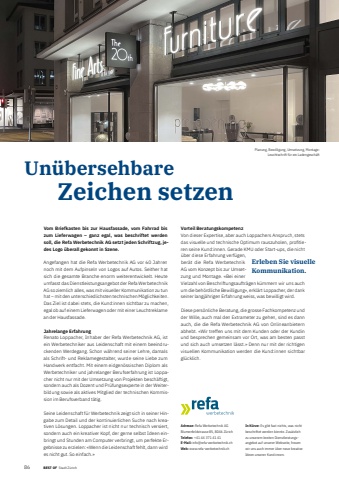 186 BEST OF BEST OF Portrait xxx Stadt Z%u00fcrichUn%u00fcbersehbare Zeichen setzenAdresse: Refa Werbetechnik AGBlumenfeldstrasse 85, 8046 Z%u00fcrichTelefon: +41 44 371 41 41E-Mail: info@refa-werbetechnik.chWeb: www.refa-werbetechnik.chIn K%u00fcrze: Es gibt fast nichts, was nicht beschriftet werden k%u00f6nnte. Zus%u00e4tzlich zu unserem breiten Dienstleistungsangebot auf unserer Webseite, freuen wir uns auch immer %u00fcber neue kreative Ideen unserer Kund:innen.Vom Briefkasten bis zur Hausfassade, vom Fahrrad bis zum Lieferwagen %u2013 ganz egal, was beschriftet werden soll, die Refa Werbetechnik AG setzt jeden Schriftzug, jedes Logo %u00fcberall gekonnt in Szene.Angefangen hat die Refa Werbetechnik AG vor 60 Jahren noch mit dem Aufpinseln von Logos auf Autos. Seither hat sich die gesamte Branche enorm weiterentwickelt. Heute umfasst das Dienstleistungsangebot der Refa Werbetechnik AG so ziemlich alles, was mit visueller Kommunikation zu tun hat %u2013 mit den unterschiedlichsten technischen M%u00f6glichkeiten. Das Ziel ist dabei stets, die Kund:innen sichtbar zu machen, egal ob auf einem Lieferwagen oder mit einer Leuchtreklame an der Hausfassade. Jahrelange ErfahrungRenato Loppacher, Inhaber der Refa Werbetechnik AG, ist ein Werbetechniker aus Leidenschaft mit einem beeindruckenden Werdegang. Schon w%u00e4hrend seiner Lehre, damals als Schrift- und Reklamegestalter, wurde seine Liebe zum Handwerk entfacht. Mit einem eidgen%u00f6ssischen Diplom als Werbetechniker und jahrelanger Berufserfahrung ist Loppacher nicht nur mit der Umsetzung von Projekten besch%u00e4ftigt, sondern auch als Dozent und Pr%u00fcfungsexperte in der Weiterbildung sowie als aktives Mitglied der technischen Kommission im Berufsverband t%u00e4tig. Seine Leidenschaft f%u00fcr Werbetechnik zeigt sich in seiner Hingabe zum Detail und der kontinuierlichen Suche nach kreativen L%u00f6sungen. Loppacher ist nicht nur technisch versiert, sondern auch ein kreativer Kopf, der gerne selbst Ideen einbringt und Stunden am Computer verbringt, um perfekte Ergebnisse zu erzielen: %u00abWenn die Leidenschaft fehlt, dann wird es nicht gut. So einfach.%u00bbVorteil Beratungskompetenz Von dieser Expertise, aber auch Loppachers Anspruch, stets das visuelle und technische Optimum rauszuholen, profi tieren seine Kund:innen. Gerade KMU oder Start-ups, die nicht %u00fcber diese Erfahrung verf%u00fcgen, ber%u00e4t die Refa Werbetechnik AG vom Konzept bis zur Umsetzung und Montage. %u00abBei einer Vielzahl von Beschriftungsauftr%u00e4gen k%u00fcmmern wir uns auch um die beh%u00f6rdliche Bewilligung%u00bb, erkl%u00e4rt Loppacher, der dank seiner langj%u00e4hrigen Erfahrung weiss, was bewilligt wird.Diese pers%u00f6nliche Beratung, die grosse Fachkompetenz und der Wille, auch mal den Extrameter zu gehen, sind es dann auch, die die Refa Werbetechnik AG von Onlineanbietern abhebt. %u00abWir treffen uns mit dem Kunden oder der Kundin und besprechen gemeinsam vor Ort, was am besten passt und sich auch umsetzen l%u00e4sst.%u00bb Denn nur mit der richtigen visuellen Kommunikation werden die Kund:innen sichtbar gl%u00fccklich. Erleben Sie visuelle Kommunikation.Planung, Bewilligung, Umsetzung, Montage: Leuchtschrift f%u00fcr ein Ladengesch%u00e4ft