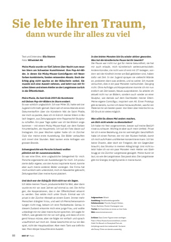 188 BEST OF BEST OF PromiText und Intervie Elio StammFoto: Witwinkel AGMoira Musio wurde vor f%u00fcnf Jahren %u00fcber Nacht zum neusten Stern am Schweizer Kunsthimmel. Ihre Pop-Art-Bilder, in denen Sie Micky-Mouse-Comicfi guren mit Neonfarben kombinierte, fanden reissenden Absatz. Doch der Erfolg ging nicht spurlos an der B%u00fclacherin vorbei. Sie musste sich eine Auszeit nehmen, und kehrt nun mit frischen Ideen und einem Atelier an der Langstrasse zur%u00fcck in die %u00d6ffentlichkeit.Moira Musio, Du hast Ende 2019 die Kunstszene mit Deinen Pop-Art-Bildern im Sturm erobert. Es war wirklich unglaublich. Ich war Mitte 20, hatte seit der Jugend nicht mehr gemalt. Dann sah ich eines Abends einen Dokumentarfi lm %u00fcber die K%u00fcnstlerin Niki de Saint Phalle, der mich so packte, dass ich im Estrich meiner Eltern in B%u00fclach begann, aus Zeitungspapier eine Pappmach%u00e9-Skulptur zu schaffen. Ein paar Tage sp%u00e4ter war ich bei Bildern angekommen %u2013 mit einem Micky-Mouse-Kopf, von dem Farben hinunterlaufen, als Hauptmotiv. Ich lud ein Foto davon auf Instagram. Ein paar Wochen sp%u00e4ter hatte ich im Z%u00fcrcher Club Vior meine erste Ausstellung. Die Bilder verkauften sich innert drei Stunden. Bald kamen erste Anfragen von grossen Brands.Schwergewichte wie Porsche Schweiz wollten pl%u00f6tzlich mit Dir zusammenarbeiten.Es war eine Ehre, eine unglaubliche Gelegenheit f%u00fcr mich. Porsche organisierte vier Ausstellungen f%u00fcr mich. Ich produzierte daf%u00fcr eigene, von den Autos inspirierte Kunst, konnte aber auch meine anderen Bilder vorzeigen. Die Firma hat mich wirklich sehr unterst%u00fctzt, mich im Newsletter gebracht, Zeitungsartikel %u00fcber meine Kunst platziert. Und doch war der Erfolg f%u00fcr Dich nicht nur ein Segen.Ich lebte meinen Traum, produzierte Bild f%u00fcr Bild, aber dann wurde es mir vor zwei Jahren auf einmal zu viel. Die Anfragen, die Kooperationen, das in der %u00d6ffentlichkeit erkannt zu werden. Das setzte mich unter Druck. Einmal war ich privat in der Z%u00fcrcher Altstadt an einem Event. Immer mehr Menschen dr%u00e4ngten hinzu, und weil ich Menschenansammlungen nicht mag, bekam ich eine Panikattacke. Genau in diesem Zustand erkannte mich eine junge Frau, und wollte unbedingt mit mir %u00fcber meine Kunst sprechen. Ich sagte ihr h%u00f6flich, was gerade mit mir vor sich ging, und dass ich dringend hinaus m%u00fcsse, aber sie folgte mir einfach und sprach unaufh%u00f6rlich auf mich ein. Diese Geschichte ist nur ein Beispiel, nicht der Hauptausl%u00f6ser. Aber mein Tank war defi nitiv leer. Mein K%u00f6rper brauchte eine Auszeit.In den letzten Monaten bist Du wieder aktiver geworden. Was hat die k%u00fcnstlerische Pause bei Dir bewirkt?Die Pause war nicht nur gut f%u00fcr meine Gesundheit, sie hat mir auch erlaubt, mich k%u00fcnstlerisch weiterzuentwickeln. Andere K%u00fcnstler, die nicht wie ich erst mit 27 loslegen, sondern seit der Kindheit immer am Ball geblieben sind, haben daf%u00fcr viel Zeit. In der Jugend sprayen sie vielleicht W%u00e4nde an, probieren dann was anderes, und so weiter. Ich musste versuchen, dies in ein paar Monaten nachzuholen. Das ging nicht. Ohne Auftr%u00e4ge und Kooperationen konnte ich mir nun endlich viel Zeit lassen, Neues ausprobieren. So arbeite ich aktuell nicht nur an Bildern, sondern auch wieder an einer Skulptur, wie damals auf dem Dachboden meiner Eltern. Meine eigene Comicfi gur, inspiriert vom All. Einen Prototyp gibt es bereits, nun bin ich daran herauszufi nden, was f%u00fcr ein Material mir am besten passt. Von Stein %u00fcber Holz bis hin zu 3D-Druck ist vieles m%u00f6glich.Was willst Du dieses Mal anders machen, um Dich nicht wieder zu %u00fcberarbeiten?Ich habe mir fest vorgenommen, besser auf meine Bed%u00fcrfnisse zu schauen. Wichtig ist aber auch mein Umfeld. Privat bin ich in einer Beziehung, die mir viel Halt gibt. Gesch%u00e4ftlich habe ich einen Partner, der mir den R%u00fccken freih%u00e4lt, damit ich mich aufs Malen und Werken konzentrieren kann. Ich bin keine Chaotin, aber doch ein Freigeist, der ein Gegen%u00fcber braucht, das Struktur in meinen Alltag bringt. Und nicht zuletzt habe ich vor ein paar Monaten mein Atelier von Glattbrugg an die Z%u00fcrcher Langstrasse gez%u00fcgelt. Meine Kunst ist laut, so wie die Langstrasse. Das passt also. Die Langstrasse gibt mir Energie, bringt Dynamik in meine Kunst.Aufgewachsen: B%u00fclachAusbildung: DetailhandelsangestellteKollaborationen: Porsche, Bang & Olufsen, Ferrari, Bucherer, Mumm Champagner usw.Tierlieb: Ihr Hund Artes ist immer an ihrer Seite. Web: www.moiramusio.comIn K%u00fcrze: Dass Comic-Figuren einen wichtigen Platz in Moira Musios Kunst einnehmen, ist kein Zufall. Ein Besuch im Disneyland Paris als Achtj%u00e4hrige weckt ihre Leidenschaft. Sie kennt alle Disney-Filme von damals auswendig.Sie lebte ihren Traum, dann wurde ihr alles zu viel