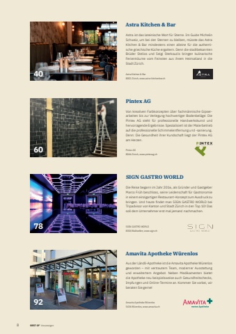 81 BEST OF BEST OF Voranzeigen TeaserAmavita Apotheke W%u00fcrenlosAus der L%u00e4ndli-Apotheke ist die Amavita Apotheke W%u00fcrenlos geworden %u2013 mit vertrautem Team, moderner Ausstattung und erweitertem Angebot. Neben Medikamenten bietet die Apotheke neu beispielsweise auch Gesundheitschecks, Impfungen und Online-Termine an. Kommen Sie vorbei, wir beraten Sie gerne!Amavita Apotheke W%u00fcrenlos5436 W%u00fcrenlos, www.amavita.ch92Pintex AGVon kreativen Farbkonzepten %u00fcber fachm%u00e4nnische Gipserarbeiten bis zur Verlegung hochwertiger Bodenbel%u00e4ge: Die Pintex AG steht f%u00fcr professionelle Handwerkskunst und hervorragende Ergebnisse. Spezialisiert ist der Malerbetrieb auf die professionelle Schimmelentfernung und -sanierung. Denn: Die Gesundheit ihrer Kundschaft liegt der Pintex AG am Herzen. Astra Kitchen & BarAstra ist das lateinische Wort f%u00fcr Sterne. Im Guide Michelin Schweiz, um bei den Sternen zu bleiben, m%u00fcsste das Astra Kitchen & Bar mindestens einen alleine f%u00fcr die authentische griechische K%u00fcche ergattern. Denn die stadtbekannten Br%u00fcder Stelios und Seigi Sterkoudis bringen kulinarische Ferientr%u00e4ume vom Feinsten aus ihrem Heimatland in die Stadt Z%u00fcrich.Pintex AG8046 Z%u00fcrich, www.pintexag.chAstra Kitchen & Bar8001 Z%u00fcrich, www.astra-kitchenbar.ch60 m a l e r g i p s e r p a r k e t tSIGN GASTRO WORLDDie Reise begann im Jahr 2016, als Gr%u00fcnder und Gastgeber Marco Fr%u00fch beschloss, seine Leidenschaft f%u00fcr Gastronomie in einem einzigartigen Restaurant-Konzept zum Ausdruck zu bringen. Und heute fi ndet man SIGN GASTRO WORLD bei Tripadvisor von Kanton und Stadt Z%u00fcrich in den Top 10! Das soll dem Unternehmer erst mal jemand nachmachen.SIGN GASTRO WORLD 8304 Wallisellen, www.sign.ch7840