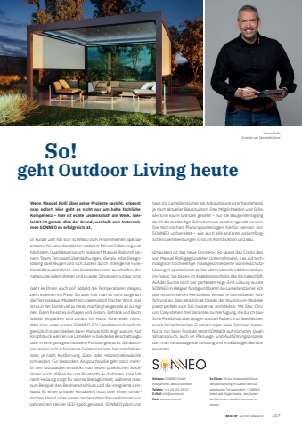 BEST OFBEST OF Z%u00fcrcher Oberland Portrait xxx 1071 So!geht Outdoor Living heuteAdresse: SONNEO GmbHRiedgarten 6, 8600 D%u00fcbendorfTelefon: +41 44 501 40 53E-Mail: info@sonneo.chWeb: www.sonneo.chIn K%u00fcrze: Ob als freistehende Terrassen%u00fcberdachung im Garten oder als angebautes Terrassendach %u2013 SONNEO bietet alle M%u00f6glichkeiten, den Garten als Wohnraum deutlich intensiver zu nutzen.Wenn Manuel Rolli %u00fcber seine Projekte spricht, erkennt man sofort: Hier geht es nicht nur um hohe fachliche Kompetenz %u2013 hier ist echte Leidenschaft am Werk. Vielleicht ist gerade dies der Grund, weshalb sein Unternehmen SONNEO so erfolgreich ist. In kurzer Zeit hat sich SONNEO zum renommierten Spezialanbieter f%u00fcr Lamellend%u00e4cher etabliert. Mit viel Erfahrung und h%u00f6chstem Qualit%u00e4tsanspruch realisiert Manuel Rolli mit seinem Team Terrassen%u00fcberdachungen, die als edle Designl%u00f6sung %u00fcberzeugen und sich zudem durch intelligente Funktionalit%u00e4t auszeichnen. Um Outdoorbereiche zu schaffen, die nahezu bei jedem Wetter und zu jeder Jahreszeit nutzbar sind.Geht es Ihnen auch so? Sobald die Temperaturen steigen, zieht es einen ins Freie. Oft aber h%u00e4lt man es nicht lange auf der Terrasse aus: Mal geht ein ungem%u00fctlich frischer Wind, mal ist es in der Sonne viel zu heiss, mal f%u00e4ngt es gerade an zu regnen. Dann heisst es Auflagen und Kissen, Getr%u00e4nk und Buch wieder einpacken und zur%u00fcck ins Haus. Oder eben nicht: Weil man unter einem SONNEO SO! Lamellendach einfach gem%u00fctlich sitzen bleiben kann. Manuel Rolli zeigt, warum: Auf Knopfdruck werden die Lamellen in die ideale Beschattungsoder in eine ganz geschlossene Position gebracht. Ger%u00e4uschlos lassen sich sch%u00fctzende Seitenmarkisen herunterfahren oder, je nach Ausf%u00fchrung, Glas- oder Holzschiebew%u00e4nde schliessen. F%u00fcr besonders Anspruchsvolle geht noch mehr: In den St%u00fctzs%u00e4ulen entdeckt man neben praktischen Steckdosen auch USB-Hubs und Bluetooth-Audioboxen. Eine Infrarot-Heizung sorgt f%u00fcr warme Behaglichkeit, w%u00e4hrend man zum Beispiel den Beameranschluss und die integrierte Leinwand f%u00fcr einen privaten Kinoabend nutzt oder einen romantischen Abend unter einem zauberhaften Sternenhimmel aus zahlreichen kleinen LED-Spots geniesst. SONNEO plant und baut die Lamellend%u00e4cher als Anbaul%u00f6sung oder freistehend, je nach aktueller Bausituation. Den M%u00f6glichkeiten und Gr%u00f6ssen sind kaum Grenzen gesetzt %u2013 nur die Baugenehmigung durch die zust%u00e4ndige Beh%u00f6rde muss vorab eingeholt werden. Die technischen Planungsunterlagen hierf%u00fcr werden von SONNEO vorbereitet %u2013 wie auch alle anderen vollumf%u00e4nglichen Dienstleistungen rund um Konstruktion und Bau.%u00abDraussen ist das neue Drinnen%u00bb: So lautet das Credo des von Manuel Rolli gegr%u00fcndeten Unternehmens, das auf technologisch hochwertige massgeschneiderte SonnenschutzL%u00f6sungen spezialisiert ist. Vor allem Lamellend%u00e4cher stehen im Fokus: Sie bilden im Angebotsportfolio das Kerngesch%u00e4ft. Auf der Suche nach der perfekten High-End-L%u00f6sung wurde SONNEO in Belgien f%u00fcndig und bietet die Lamellend%u00e4cher SO! des renommierten Herstellers Winsol in individueller Ausf%u00fchrung an. Das geradlinige Design der Aluminium-Modelle passt perfekt zum Stil moderner Architektur. Mit Star, Chic und Cosy stehen drei Varianten zur Verf%u00fcgung, die durch bauliche Flexibilit%u00e4t %u00fcberzeugen und bei Farben und Oberfl%u00e4chen sowie bei technischen Erweiterungen viele Optionen bieten. Nicht nur beim Produkt setzt SONNEO auf h%u00f6chsten Qualit%u00e4tsanspruch, auch im Planungs- und Ausf%u00fchrungsprozess darf man herausragende Leistung und erstklassigen Service erwarten.Manuel Rolli, Gr%u00fcnder und Gesch%u00e4ftsf%u00fchrer