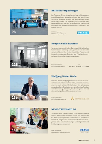BEST OF BEST OF Voranzeigen Taser 92Wolfgang Walter WullePotenzial-Profi ler Wolfgang Walter Wulle unterst%u00fctzt Unternehmerinnen und Unternehmer dabei, innere Blockaden zu erkennen sowie zu l%u00f6sen. Mit Klarheit und Sinn gelingt es so, mutige berufliche Entscheidungen zu treffen. Das Resultat: mehr Orientierung, Motivation, Freude am eigenen Tun und eine nachhaltige Zukunft f%u00fcr das Unternehmen.Wolfgang Walter Wulle8702 Zollikon, www.wwwulle.ch136BRIEGER VerpackungenDer Fokus von Brieger Verpackungen liegt auf innovativen, umweltfreundlichen Verpackungsideen, die sowohl den Schutz der Produkte als auch die Nachhaltigkeit in den Mittelpunkt stellen. Die Entwicklung von kreativen Verpackungsl%u00f6sungen, die den Versand sicherer machen und gleichzeitig den %u00f6kologischen Fussabdruck minimieren, hat oberste Priorit%u00e4t.BRIEGER Verpackungen8952 Schlieren, www.brieger.ch98Neupert Vuille PartnersVorsorgen ist besser als heilen. Das gilt auch f%u00fcr juristischen Rat. Wer diesen rechtzeitig sucht, spart Geld und vermeidet schlaflose N%u00e4chte. Eine Z%u00fcrcher Kanzlei l%u00f6st Probleme und Herausforderungen von Gewerbe- und Privatkund:innen %u2013 meistens ohne vor Gericht gehen zu m%u00fcssen.Neupert Vuille Partners8702 Zollikon, www.nplaw.ch128NEWO TREUHAND AGZahlen verstehen, Klarheit schaffen, Zeit sparen: Maria Mazza und ihr Team machen komplexe Finanz- und Steuer fragen f%u00fcr KMU und Privatpersonen verst%u00e4ndlich und handhabbar. Pers%u00f6nlich, pragmatisch und mit Gesp%u00fcr f%u00fcr Menschen sorgen sie daf%u00fcr, dass Entscheidungen fundiert getroffen und Freir%u00e4ume gewonnen werden.NEWO TREUHAND AG8640 Rapperswil, www.newotreuhand.ch148