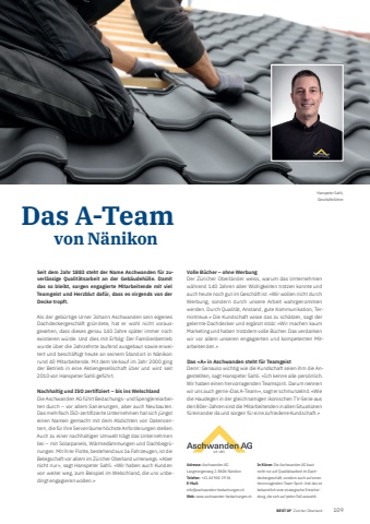 BEST OFBEST OF Z%u00fcrcher Oberland Portrait xxx 1091Das A-Team von N%u00e4nikon Seit dem Jahr 1883 steht der Name Aschwanden f%u00fcr zuverl%u00e4ssige Qualit%u00e4tsarbeit an der Geb%u00e4udeh%u00fclle. Damit das so bleibt, sorgen engagierte Mitarbeitende mit viel Teamgeist und Herzblut daf%u00fcr, dass es nirgends von der Decke tropft.Als der geb%u00fcrtige Urner Johann Aschwanden sein eigenes Dachdeckergesch%u00e4ft gr%u00fcndete, hat er wohl nicht vorausgesehen, dass dieses genau 140 Jahre sp%u00e4ter immer noch existieren w%u00fcrde. Und dies mit Erfolg: Der Familienbetrieb wurde %u00fcber die Jahrzehnte laufend ausgebaut sowie erweitert und besch%u00e4ftigt heute an seinem Standort in N%u00e4nikon rund 40 Mitarbeitende. Mit dem Verkauf im Jahr 2000 ging der Betrieb in eine Aktiengesellschaft %u00fcber und wird seit 2010 von Hanspeter Sahli gef%u00fchrt.Nachhaltig und ISO zertifi ziert %u2013 bis ins WelschlandDie Aschwanden AG f%u00fchrt Bedachungs- und Spenglereiarbeiten durch %u2013 vor allem Sanierungen, aber auch Neubauten. Das mehrfach ISO-zertifi zierte Unternehmen hat sich j%u00fcngst einen Namen gemacht mit dem Abdichten von Datencentern, die f%u00fcr ihre Serverr%u00e4ume h%u00f6chste Anforderungen stellen. Auch zu einer nachhaltigen Umwelt tr%u00e4gt das Unternehmen bei %u2013 mit Solarpanels, W%u00e4rmed%u00e4mmungen und Dachbegr%u00fcnungen. Mit ihrer Flotte, bestehend aus 16 Fahrzeugen, ist die Belegschaft vor allem im Z%u00fcrcher Oberland unterwegs. %u00abAber nicht nur%u00bb, sagt Hanspeter Sahli. %u00abWir haben auch Kunden von weiter weg, zum Beispiel im Welschland, die uns unbedingt engagieren wollen.%u00bb Adresse: Aschwanden AGLangmorgenweg 2, 8606 N%u00e4nikonTelefon: +41 44 940 19 36E-Mail:info@aschwanden-bedachungen.chWeb: www.aschwanden-bedachungen.chIn K%u00fcrze: Die Aschwanden AG baut nicht nur auf Qualit%u00e4tsarbeit im Dachdeckergesch%u00e4ft, sondern auch auf einen hervorragenden Team-Spirit. Und das ist bekanntlich eine strategische Entscheidung, die sich auf jeden Fall auszahlt.Hanspeter Sahli, Gesch%u00e4ftsf%u00fchrerVolle B%u00fccher %u2013 ohne WerbungDer Z%u00fcricher Oberl%u00e4nder weiss, warum das Unternehmen w%u00e4hrend 140 Jahren allen Widrigkeiten trotzen konnte und auch heute noch gut im Gesch%u00e4ft ist. %u00abWir wollen nicht durch Werbung, sondern durch unsere Arbeit wahrgenommen werden. Durch Qualit%u00e4t, Anstand, gute Kommunikation, Termintreue.%u00bb Die Kundschaft wisse das zu sch%u00e4tzen, sagt der gelernte Dachdecker und erg%u00e4nzt stolz: %u00abWir machen kaum Marketing und haben trotzdem volle B%u00fccher. Das verdanken wir vor allem unseren engagierten und kompetenten Mitarbeitenden.%u00bbDas %u00abA%u00bb in Aschwanden steht f%u00fcr TeamgeistDenn: Genauso wichtig wie die Kundschaft seien ihm die Angestellten, sagt Hanspeter Sahli. %u00abIch kenne alle pers%u00f6nlich. Wir haben einen hervorragenden Teamspirit. Darum nennen wir uns auch gerne %u2039Das A-Team%u203a%u00bb, sagt er schmunzelnd. %u00abWie die Haudegen in der gleichnamigen ikonischen TV-Serie aus den 80er-Jahren sind die Mitarbeitenden in allen Situationen f%u00fcreinander da und sorgen f%u00fcr eine zufriedene Kundschaft.%u00bb