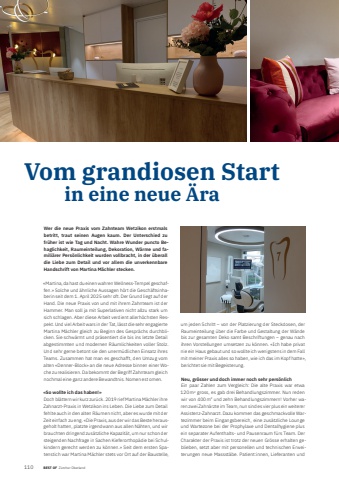 110 BEST OF BEST OF Z%u00fcrcher Oberland Portrait xxxVom grandiosen Start in eine neue %u00c4raWer die neue Praxis vom Zahnteam Wetzikon erstmals betritt, traut seinen Augen kaum. Der Unterschied zu fr%u00fcher ist wie Tag und Nacht. Wahre Wunder puncto Behaglichkeit, Raumeinteilung, Dekoration, W%u00e4rme und famili%u00e4rer Pers%u00f6nlichkeit wurden vollbracht, in der %u00fcberall die Liebe zum Detail und vor allem die unverkennbare Handschrift von Martina M%u00e4chler stecken.%u00abMartina, da hast du einen wahren Wellness-Tempel geschaffen.%u00bb Solche und %u00e4hnliche Aussagen h%u00f6rt die Gesch%u00e4ftsinhaberin seit dem 1. April 2025 sehr oft. Der Grund liegt auf der Hand. Die neue Praxis von und mit ihrem Zahnteam ist der Hammer. Man soll ja mit Superlativen nicht allzu stark um sich schlagen. Aber diese Arbeit verdient allerh%u00f6chsten Respekt. Und viel Arbeit wars in der Tat, l%u00e4sst die sehr engagierte Martina M%u00e4chler gleich zu Beginn des Gespr%u00e4chs durchblicken. Sie schw%u00e4rmt und pr%u00e4sentiert die bis ins letzte Detail abgestimmten und modernen R%u00e4umlichkeiten voller Stolz. Und sehr gerne betont sie den unerm%u00fcdlichen Einsatz ihres Teams. Zusammen hat man es geschafft, den Umzug vom alten %u00abDenner-Block%u00bb an die neue Adresse binnen einer Woche zu realisieren. Da bekommt der Begriff Zahnteam gleich nochmal eine ganz andere Bewandtnis. Nomen est omen.%u00abSo wollte ich das haben!%u00bbDoch bl%u00e4ttern wir kurz zur%u00fcck. 2019 rief Martina M%u00e4chler ihre Zahnarzt-Praxis in Wetzikon ins Leben. Die Liebe zum Detail fehlte auch in den alten R%u00e4umen nicht, aber es wurde mit der Zeit einfach zu eng. %u00abDie Praxis, aus der wir das Beste herausgeholt hatten, platzte irgendwann aus allen N%u00e4hten, und wir brauchten dringend zus%u00e4tzliche Kapazit%u00e4t, um nur schon der steigenden Nachfrage in Sachen Kieferorthop%u00e4die bei Schulkindern gerecht werden zu k%u00f6nnen.%u00bb Seit dem ersten Spatenstich war Martina M%u00e4chler stets vor Ort auf der Baustelle, um jeden Schritt %u2013 von der Platzierung der Steckdosen, der Raumeinteilung %u00fcber die Farbe und Gestaltung der W%u00e4nde bis zur gesamten Deko samt Beschriftungen %u2013 genau nach ihren Vorstellungen umsetzen zu k%u00f6nnen. %u00abIch habe privat nie ein Haus gebaut und so wollte ich wenigstens in dem Fall mit meiner Praxis alles so haben, wie ich das im Kopf hatte%u00bb, berichtet sie mit Begeisterung.Neu, gr%u00f6sser und doch immer noch sehr pers%u00f6nlichEin paar Zahlen zum Vergleich: Die alte Praxis war etwa 120 m2 gross, es gab drei Behandlungszimmer. Nun reden wir von 400 m2 und zehn Behandlungszimmern! Vorher waren zwei Zahn%u00e4rzte im Team, nun sind es vier plus ein weiterer Assistenz- Zahnarzt. Dazu kommen das geschmackvolle Wartezimmer beim Eingangsbereich, eine zus%u00e4tzliche Lounge und Wartezone bei der Prophylaxe und Dentalhygiene plus ein separater Aufenthalts- und Pausenraum f%u00fcrs Team. Der Charakter der Praxis ist trotz der neuen Gr%u00f6sse erhalten geblieben, setzt aber mit personellen und technischen Erweiterungen neue Massst%u00e4be. Patient:innen, Lieferanten und
