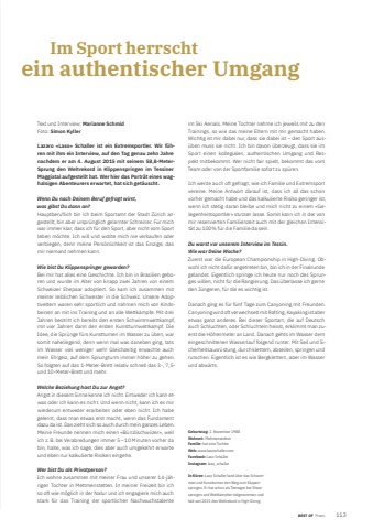 BEST OF BEST OF Promi 1132 Im Sport herrschtein authentischer UmgangText und Intervie Marianne SchmidFoto: Simon KyllerLazaro %u00abLaso%u00bb Schaller ist ein Extremsportler. Wir f%u00fchren mit ihm ein Interview, auf den Tag genau zehn Jahre nachdem er am 4. August 2015 mit seinem 58,8-MeterSprung den Weltrekord in Klippenspringen im Tessiner Maggiatal aufgestellt hat. Wer hier das Portr%u00e4t eines waghalsigen Abenteurers erwartet, hat sich get%u00e4uscht.Wenn Du nach Deinem Beruf gefragt wirst, was gibst Du dann an?Hauptberuflich bin ich beim Sportamt der Stadt Z%u00fcrich angestellt, bin aber urspr%u00fcnglich gelernter Schreiner. F%u00fcr mich war immer klar, dass ich f%u00fcr den Sport, aber nicht vom Sport leben m%u00f6chte. Ich will und wollte mich nie verkaufen oder verbiegen, denn meine Pers%u00f6nlichkeit ist das Einzige, das mir niemand nehmen kann.Wie bist Du Klippenspringer geworden? Bei mir hat alles eine Geschichte. Ich bin in Brasilien geboren und wurde im Alter von knapp zwei Jahren von einem Schweizer Ehepaar adoptiert. So kam ich zusammen mit meiner leiblichen Schwester in die Schweiz. Unsere Adoptiveltern waren sehr sportlich und nahmen mich von Kindsbeinen an mit ins Training und an alle Wettk%u00e4mpfe. Mit drei Jahren bestritt ich bereits den ersten Schwimmwettkampf, mit vier Jahren dann den ersten Kunstturnwettkampf. Die Idee, die Spr%u00fcnge f%u00fcrs Kunstturnen im Wasser zu %u00fcben, war somit naheliegend, denn wenn mal was daneben ging, tats im Wasser viel weniger weh! Gleichzeitig erwachte auch mein Ehrgeiz, auf dem Sprungturm immer h%u00f6her zu gehen. So folgten auf das 1-Meter-Brett relativ schnell das 3-, 7,5- und 10-Meter-Brett und mehr.Welche Beziehung hast Du zur Angst?Angst in diesem Sinne kenne ich nicht. Entweder ich kann etwas oder ich kann es nicht. Und wenn nicht, kann ich es mir wiederum entweder erarbeiten oder eben nicht. Ich habe gelernt, dass man etwas erst macht, wenn das Fundament dazu da ist. Das zieht sich so auch durch mein ganzes Leben. Meine Freunde nennen mich einen %u00abB%u00fcnzlischwiizer%u00bb, weil ich z. B. bei Verabredungen immer 5 %u2013 10 Minuten vorher da bin, halte, was ich sage, dies aber auch umgekehrt erwarte und eben nur kalkulierte Risiken eingehe.Wer bist Du als Privatperson?Ich wohne zusammen mit meiner Frau und unserer 14-j%u00e4hrigen Tochter in Mettmenstetten. In meiner Freizeit bin ich so oft wie m%u00f6glich in der Natur und ich engagiere mich auch stark f%u00fcr das Training der sportlichen Nachwuchstalente Geburtstag: 2. November 1988Wohnort: MettmenstettenFamilie: hat eine TochterWeb: www.lasoschaller.comFacebook: Laso SchallerInstagram: laso_schallerIn K%u00fcrze: Laso Schaller fand %u00fcber das Schwimmen und Kunstturnen den Weg zum Klippenspringen. Er hat schon als Teenager bei Showspringen und Wettk%u00e4mpfen teilgenommen und h%u00e4lt seit 2015 den Weltrekord in High-Diving. im Ski Aerials. Meine Tochter nehme ich jeweils mit zu den Trainings, so wie das meine Eltern mit mir gemacht haben. Wichtig ist mir dabei nur, dass sie dabei ist %u2013 den Sport aus%u00fcben muss sie nicht. Ich bin davon %u00fcberzeugt, dass sie im Sport einen kollegialen, authentischen Umgang und Respekt mitbekommt. Wer nicht fair spielt, bekommt das vom Team oder von der Sportfamilie sofort zu sp%u00fcren.Ich werde auch oft gefragt, wie ich Familie und Extremsport vereine. Meine Antwort darauf ist, dass ich all das schon vorher gemacht habe und das kalkulierte Risiko geringer ist, wenn ich stetig daran bleibe und mich nicht zu einem %u00abGelegenheitssportler%u00bb stutzen lasse. Somit kann ich in der von mir reservierten Familienzeit auch mit der gleichen Intensit%u00e4t zu 100 % f%u00fcr die Familie da sein.Du warst vor unserem Interview im Tessin. Wie war Deine Woche?Zuerst war die European Championship in High-Diving. Obwohl ich nicht daf%u00fcr angetreten bin, bin ich in der Finalrunde gelandet. Eigentlich springe ich heute nur noch des Sprunges willen, nicht f%u00fcr die Rangierung. Das %u00fcberlasse ich gerne den J%u00fcngeren, f%u00fcr die es wichtig ist.Danach ging es f%u00fcr f%u00fcnf Tage zum Canyoning mit Freunden. Canyoning wird oft verwechselt mit Rafting, Kayaking ist aber etwas ganz anderes. Bei dieser Sportart, die auf Deutsch auch Schluchten, oder Schluchteln heisst, erklimmt man zuerst die H%u00f6henmeter an Land. Danach gehts im Wasser dem eingeschnittenen Wasserlauf folgend runter. Mit Seil und Sicherheitsausr%u00fcstung, durch klettern, abseilen, springen und rutschen. Eigentlich ist es wie Bergklettern, aber im Wasser und abw%u00e4rts.