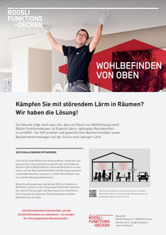 114 BEST OF xxxK%u00e4mpfen Sie mit st%u00f6rendem L%u00e4rm in R%u00e4umen? Wir haben die L%u00f6sung!Die Akustik tr%u00e4gt stark dazu bei, dass ein Raum zur Wohlf%u00fchloase wird. R%u00f6%u00f6sli Funktionsdecken ist Expertin darin, optimalen Raumkomfort zu schaffen. Sie hilft privaten und gewerblichen Bauherrschaften sowie Bauherren vertretungen auf der Suche nach weniger L%u00e4rm.L%u00e4rm ist f%u00fcr jeden Menschen etwas anderes. St%u00f6render und andauernder L%u00e4rm belastet uns jedoch alle. Innerhalb von R%u00e4umen gibt es M%u00f6glichkeiten, st%u00f6rende Ger%u00e4usche zu reduzieren. %u00abIn der Raumakustik werden Schallenergie optimiert und Schallreflexionen reduziert%u00bb, erkl%u00e4rt Ren%u00e9 R%u00f6%u00f6sli, Inhaber und Verwaltungsratspr%u00e4sident. R%u00f6%u00f6sli Funktionsdecken, seit Herbst 2025 mit Standort in Winterthur, geh%u00f6rt zu den schweizweit f%u00fchrenden Spezialisten, wenn es darum geht, die Raumakustik zu verbessern. Ihre individuell konzipierten Funktionsdecken schaffen Wohlbefinden von oben. R%u00f6%u00f6sli Funktionsdecken ist spezialisiert auf das Fachgebiet Raumakustik. Mehr zur wirkungsvollen Optimierung und zum bestehenden Mythos erfahren Sie hier.%u00abFunktionsdecken sind perfekt, um die Schallreflexionen zu reduzieren %u2013 sie sorgen f%u00fcr eine angenehme Raumakustik.%u00bbDIE SCHALLENERGIE OPTIMIERENWOHLBEFINDEN VON OBENMenschen f%u00fchlen sich in R%u00e4umen mit optimalen Bedingungen wohl. Wir schaffen mit unseren Funktionsdecken %u00fcberall R%u00e4umlichkeiten, die mit Genuss und allen Sinnen erlebt werden k%u00f6nnen %u2013 Wohlbefinden von oben.roosliag.chR%u00f6%u00f6sli AGRiedhofstrasse 67, 8408 Winterthur044 344 44 55, info@roosliag.chwww.roosliag.ch