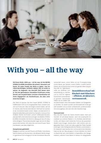 10 BEST OF BEST OF %u00dcberregional Portrait xxxMit ihrem Motto %u00abWith you %u2013 all the way%u00bb ist die NEVES, STIERLE & HORN Immobilien AG pr%u00e4sent, fokussiert und bereit, f%u00fcr jedes Projekt das Beste zu geben. Vom ber%u00fchmt-ber%u00fcchtigten verflixten siebten Jahr ist nichts zu sp%u00fcren. Im Gegenteil, das Gesch%u00e4ft l%u00e4uft besser denn je. Die drei gestandenen Immobilien-Fachfrauen ernten derzeit, was sie ges%u00e4t haben. Und das in Kombination mit ihrem Engagement als Familienfrauen, die alles unter einen Hut bringen.Der Stolz ist sp%u00fcrbar. Die drei Frauen NEVES, STIERLE & HORN bilden nicht nur ein eingespieltes Team, sondern sind sich auch bewusst, dass sie einiges erreicht haben, seit sie ihr kleines, aber feines Unternehmen 2019 auf die Landkarte der Immobilienmakler setzen. Dabei, und das kommt im Gespr%u00e4ch ebenfalls automatisch zur Sprache, ist es auch ein Kraftakt, Familie mit Kindern und ein mittlerweile florierendes Gesch%u00e4ft unter einen Hut zu bringen. Die NEVES, STIERLE & HORN Immobilien AG k%u00f6nnte in Bezug auf das oft diskutierte Zeitgeist-Thema Vereinbarkeit sogar als eine Art Blaupause zitiert werden. Wir reden hier von einem Frauen-Team, das beweist, was alles m%u00f6glich ist.Kompetenzen geb%u00fcndeltBegegnet sind sich die drei Frauen und M%u00fctter Carla Neves, Sandra Stierle und Sandra Horn, die allesamt bereits l%u00e4nger in irgendeiner Form erfolgreich mit der Immobilien- Branche With you %u2013 all the wayverbandelt waren, schon Jahre vor der Firmengr%u00fcndung. %u00abCarla Neves war damals unsere Chefi n%u00bb, erz%u00e4hlt Sandra Stierle, die mit Sandra Horn schon ein ganzes Leben lang befreundet ist. Irgendwann reifte der Gedanke, sich selbstst%u00e4ndig zu machen und zu dritt ein eigenes Immobilien-Unternehmen zu gr%u00fcnden. Gemeinsam haben sie vor sieben Jahren beschlossen, ihre individuellen St%u00e4rken und F%u00e4higkeiten zu b%u00fcndeln. So vereint wurden die Kompetenzen fortan gezielt verst%u00e4rkt und zu einem umfassenden, professionellen Service ausgebaut, der weit %u00fcber dem Standard liegt.Teamwork totalWas die drei Frauen bis heute erreicht haben, l%u00e4sst aufhorchen. Es will etwas heissen, wenn sie unverkaufte Immobilien von anderen Maklern in ihr Portfolio %u00fcbernehmen d%u00fcrfen und diese innert n%u00fctzlicher Frist an die passenden K%u00e4ufer:innen bringen. Sandra Horn: %u00abWir sind ein sehr eingespieltes Team, in dem sich alle zu gleichen Teilen flexibel einbringen. Gleichzeitig hat jede ihre St%u00e4rken und Vorlieben.%u00bb Im Gespr%u00e4ch l%u00e4sst Sandra Horn schmunzelnd durchblicken, dass sie bei der Akquise ganz in Ihrem Element ist, Sandra Stierle hat sich mehrheitlich im Backoffi ce und Design etabliert, w%u00e4hrend Carla Neves im Verkauf ihr allergr%u00f6sstes Immobilienverkauf mit Klarheit statt Klischees %u2013 effi zient, strukturiert, vertrauensvoll.