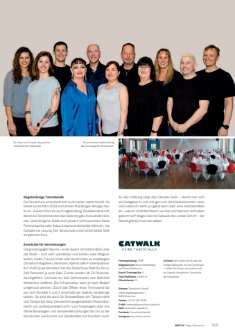 BEST OFBEST OF Region Winterthur Portrait xxx 1192Firmengr%u00fcndung: 1999Aufgebaut von: Bruno Schellenberg und Romy BiedermannAnzahl Trainingss%u00e4le: 5Total Mietfl%u00e4che: 1559,5 m2Mitarbeitende: 11Adresse: Tanzschule CatwalkUntere Vogelsangstrasse 7, 8400 WinterthurTelefon: +41 52 269 25 00 E-Mail: morefun@tanzschule-catwalk.chWeb: tanzschule-catwalk.chFacebook: Tanzschule CatwalkInstagram: tanzschule.catwalkIn K%u00fcrze: Vom ersten Schritt %u00fcber die richtige Haltung bis hin zum Turniertanz %u2013 erleben Sie Tanzen als Leidenschaft bei Catwalk, der gr%u00f6ssten Tanzschule der Ostschweiz. Regelm%u00e4ssige TanzabendeDie Tanzschule entwickelt sich auch weiter, steht nie still: So bietet sie ab M%u00e4rz 2024 zum ersten Mal Boogie-Woogie-Kurse an. Zudem f%u00fchrt sie auch regelm%u00e4ssig Tanzabende durch, damit die Teilnehmenden das Gelernte gleich anwenden k%u00f6nnen. Und %u00fcbrigens: Sollte sich jemand nicht zwischen Salsa Puertorique%u00f1a oder Salsa Cubana entscheiden k%u00f6nnen, hat Catwalk die L%u00f6sung: Die Tanzschule unterrichtet beide Stile im gleichen Kurs. Events%u00e4le f%u00fcr VermietungenDie grossz%u00fcgigen R%u00e4ume %u2013 einer davon mit tollem Blick %u00fcber die Stadt %u2013 sind sehr wandelbar und bieten viele M%u00f6glichkeiten, G%u00e4ste, Freund:innen oder Kund:innen zu empfangen. Ob Geburtstagsfeier, Seminare, Ap%u00e9ros oder Firmenanl%u00e4sse: Auf 1500 Quadratmetern hat die Tanzschule Platz f%u00fcr bis zu 240 Personen je nach Saal. Events werden ab 50 Personen durchgef%u00fchrt. Und das nur drei Gehminuten vom Bahnhof Winterthur entfernt. Die Infrastruktur kann je nach Bedarf umgenutzt werden: Durch das %u00d6ffnen einer Trennwand lassen sich die S%u00e4le 1 und 2 unterhalb der Galerie variabel gestalten. So sind sie auch f%u00fcr Grossanl%u00e4sse wie Tanzturniere und Tanzpartys ideal. Die bestens ausgestattete Infrastruktur reicht von professionellen Licht- und Tonanlagen %u00fcber moderne Baranlagen und variable Bestuhlungen bis hin zu Nebenr%u00e4umen wie Fumoir und Garderoben mit Duschen. Auch f%u00fcr das Catering sorgt das Catwalk-Team %u2013 damit man sich als Gastgeber:in voll und ganz um die G%u00e4ste k%u00fcmmern kann. Und vielleicht steht ja irgendwann bald eine Hochzeitsfeier an %u2013 warum nicht dort feiern, wo man sich kennen und lieben gelernt hat? Wagen Sie mit Catwalk den ersten Schritt %u2013 der Rest ergibt sich wie von selbst. Die schmucke Festbestuhlung l%u00e4dt zum eleganten Dinieren ein. Das Team von Catwalk, der gr%u00f6ssten Tanzschule der Ostschweiz