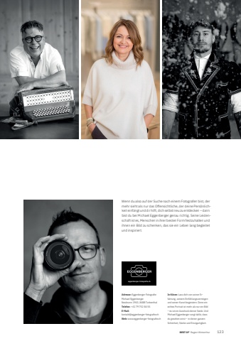 BEST OFBEST OF Region Winterthur Portrait xxx 1232Adresse: Eggenberger Fotografi eMichael EggenbergerNeubrunn 1943, 8488 TurbenthalTelefon: +41 79 752 84 55E-Mail:kontakt@eggenberger-fotografi e.chWeb: www.eggenberger-fotografi e.chIn K%u00fcrze: Lass dich von seiner Erfahrung, seinem Einf%u00fchlungsverm%u00f6gen und seiner Kunst begeistern. Denn ein echtes Portrait ist mehr als nur ein Bild %u2013 es ist ein Ausdruck deiner Seele. Und Michael Eggenberger sorgt daf%u00fcr, dass du gesehen wirst %u2013 in deiner ganzen Sch%u00f6nheit, St%u00e4rke und Einzigartigkeit.Wenn du also auf der Suche nach einem Fotografen bist, der mehr sieht als nur das Offensichtliche, der deine Pers%u00f6nlichkeit einf%u00e4ngt und dir hilft, dich selbst neu zu entdecken %u2013 dann bist du bei Michael Eggenberger genau richtig. Seine Leidenschaft ist es, Menschen in ihrer besten Form festzuhalten und ihnen ein Bild zu schenken, das sie ein Leben lang begleitet und inspiriert.