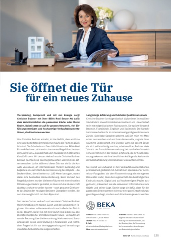 BEST OF Rund um den Z%u00fcrichsee BEST OF Portrait xxx 1251Sie %u00f6ffnet die T%u00fcr f%u00fcr ein neues ZuhauseViersprachig, kompetent und mit viel Energie sorgt Christine Bodmer mit ihrer BEKA Real Estate AG daf%u00fcr, dass Wohnimmobilien die passenden K%u00e4ufer oder Mieter fi nden. Dabei setzt sie auf ihr grosses Netzwerk, viel Einf%u00fchlungsverm%u00f6gen und hochwertige Verkaufsdokumentationen, die Emotionen wecken.Was Christine Bodmer antreibt, ist das Gef%u00fchl, dass am Ende eines gut begleiteten Immobilienverkaufs alle Parteien gl%u00fccklich sind. Die Gr%u00fcnderin und Gesch%u00e4ftsf%u00fchrerin der BEKA Real Estate AG erinnert sich an ein charmantes Riegelh%u00e4uschen aus dem Jahre 1815, das oberhalb vom Klusplatz im historischen Klusd%u00f6rfli steht: Mit dessen Verkauf wurde Christine Bodmer betraut, nachdem sie das Riegelh%u00e4uschen w%u00e4hrend vier Jahren verwalten durfte. W%u00e4hrend dieser Zeit war sie f%u00fcr die Auswahl von neuen, oft internationalen Mietern zust%u00e4ndig und begleitete im Jahr 2022 die Kernsanierung des Objekts %u2013 die Decken h%u00f6hen, die teilweise nur 1,80 Meter betrugen, waren dabei eine besondere Herausforderung. Beim Verkauf des Riegel h%u00e4uschens wurden die leeren R%u00e4ume mit einer virtuellen M%u00f6blierung einladend gestaltet, so dass sich die K%u00e4uferschaft das Haus lebhaft vorstellen konnte %u2013 nach geraumer Zeit konnte das Objekt den heutigen Besitzern %u00fcbergeben werden, die nun %u00fcberaus gl%u00fccklich mit dem Bijou sind. Seit sieben Jahren verkauft und vermietet Christine Bodmer Wohnimmobilien im Kanton Z%u00fcrich und den anliegenden Regionen. Von einer zufriedenen Kundin auch %u00abPerle des Z%u00fcrichsees%u00bb genannt, bietet sie mit ihrer BEKA Real Estate AG alle Dienstleistungen f%u00fcr Immobilienk%u00e4ufer sowie -verk%u00e4ufer an: von der Beratung %u00fcber die Vermarktung, Marktwert- und Standortanalysen sowie Unterst%u00fctzung in fi nanziellen und rechtlichen Fragen bis hin zur Vertragsgestaltung und Verwaltungsmandaten f%u00fcr bestehende Liegenschaften.Langj%u00e4hrige Erfahrung und h%u00f6chster Qualit%u00e4tsanspruchChristine Bodmer ist eidgen%u00f6ssisch diplomierte Immobilientreuh%u00e4nderin sowie Immobilienvermarkterin und -bewirtschafterin mit eidgen%u00f6ssischem Fachausweis. Sie spricht fliessend Deutsch, Franz%u00f6sisch, Englisch und Italienisch. Die Sprachkenntnisse helfen ihr im international gepr%u00e4gten Grossraum Z%u00fcrich. %u00abIch habe Sprachen gelernt, weil ich mich mit Menschen austauschen und von ihnen lernen will%u00bb, sagt sie. Man sp%u00fcrt ihre Leidenschaft, ihre Energie, wenn sie spricht. Bevor sie sich selbstst%u00e4ndig machte, arbeitete Frau Bodmer viele Jahre in der Immobilienvermarktung bei namhaften Immobilienunternehmen in der Region. Erfahrung, die ihr heute ebenso zugutekommt wie ihre beruflichen Anf%u00e4nge als Assistentin der Gesch%u00e4ftsleitung internationaler Grossunternehmen.Sie steckt viel Aufwand in ihre Verkaufsdokumentationen, professionell gestaltet mit Aufnahmen spezialisierter Architektur-Fotografen. Vor dem Fototermin sorgt sie mit eigenen Requisiten daf%u00fcr, dass die Liegenschaft den bestm%u00f6glichen Eindruck macht. Digital und auf hochwertigem Papier ausgedruckt, pr%u00e4sentiert sie alle relevanten Informationen zum Objekt und seiner Lage. Damit sorgt sie daf%u00fcr, dass f%u00fcr die passenden Interessenten nicht nur eine gute Entscheidungsgrundlage vorliegt, sondern auch Emotionen geweckt werden.Adresse: BEKA Real Estate AGOrmisstrasse 77, 8706 MeilenTelefon: +41 79 345 80 15E-Mail:christine.bodmer@bekaglobal.comWeb: www.bekarealestate.chIn K%u00fcrze: Die BEKA Real Estate AG begleitet den Verkauf und die Vermietung von Wohnimmobilien, von der Beratung %u00fcber die Vermarktung bis hin zu einzelnen Verwaltungen von Bestandsliegenschaften.