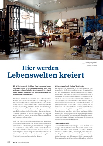 130 BEST OF BEST OF Rund um den Z%u00fcrichsee Portrait xxxDie Wohnr%u00e4ume, die Architekt Alex Herter und Innenarchitektin Diana zu F%u00fcrstenberg erschaffen, sind alles andere als nullachtf%u00fcnfzehn. Gemeinsam mit ihrer Kundschaft begeben sie sich auf eine Reise, an deren Ende ein harmonisches Zuhause steht.Am rechten Z%u00fcrichseeufer haben sich zwei Fachpersonen gefunden, deren Herz vollkommen f%u00fcr die Gestaltung von Geb%u00e4uden schl%u00e4gt. Das Atelier von Architekt Alex Herter, von der Herter Architekt GmbH und das Offi ce von Innenarchitektin Diana zu F%u00fcrstenberg, Inhaberin der DF Interior & Design GmbH, spannen seit sechs Jahren mit Erfolg zusammen. Mit dem Ziel ihrer Kundschaft nicht nur leere R%u00e4ume, sondern ein Ambiente erschaffen zu k%u00f6nnen. %u00abWir denken weit %u00fcber tragende Strukturen hinaus, wir gestalten R%u00e4ume%u00bb, sagt Diana zu F%u00fcrstenberg schmunzelnd. Dank des freundschaftlichen Miteinanders von Architektur und Innenarchitektur ist es den beiden m%u00f6glich, ihren Mandant:innen ein schl%u00fcsselfertiges neues Heim zu %u00fcbergeben. %u00abIm pers%u00f6nlichen Austausch mit den Bauherrschaften m%u00f6chten wir zu Ver%u00e4nderungen inspirieren, aber auf keinen Fall Fremdk%u00f6rper f%u00fcr die zuk%u00fcnftigen Bewohnenden schaffen%u00bb, so Alex Herter. Am Ende ihrer mit viel Leidenschaft ausgef%u00fchrten Arbeit steht immer ein harmonisches Ganzes. Hier werden Lebenswelten kreiertWeiterentwickeln mit Blick auf BestehendesAlex Herter ist der Wegbereiter dazu. In seinem Atelier in Erlenbach wird die Struktur und Erscheinung der zahlreichen Um- und Anbauprojekte, aber auch von kompletten Neubauten gestaltet. Besonders wichtig ist ihm dabei ortsspezifi sch vorzugehen und im Sinne der Umgebung L%u00f6sungen zu fi nden. %u00abHeute ist der Individualismus ausgepr%u00e4gt, f%u00fcr mich soll ein Geb%u00e4ude aber auch im architektonischen Kontext stehen%u00bb, betont Herter. Dazu arbeitet sich der Architekt erst durch die oftmals zahlreichen Zeitschichten der H%u00e4user hindurch, um herauszufi nden, wie diese fr%u00fcher einmal aussahen. Nur so k%u00f6nnen neue und zugleich stimmige Einheiten entstehen. Diese bestehen allerdings nicht bloss aus kahlen H%u00fcllen, sondern sind bis zum letzten Detail ausgearbeitete Lebenswelten, da das kreative Team sich um alles Gedanken macht %u2013 von der am richtigen Ort platzierten Steckdose bis hin zum ins Wohnkonzept passenden Kaffeel%u00f6ffel.Lebendige BaustellenHier kommt Diana zu F%u00fcrstenberg ins Spiel. In ihrem weitl%u00e4ufi gen Atelier und Showroom in K%u00fcsnacht erstellt sie im engen Austausch mit der Kundschaft und anhand der Architekturpl%u00e4ne von Alex Herter, Farbkonzepte, w%u00e4hlt die passenden T%u00fcrgriffe oder hochmoderne K%u00fcchenger%u00e4te und arbeitet Lichtkonzepte aus. %u00abEin warmes Licht, das spannende Ecken ausleuchtet und harmonische %u00dcberg%u00e4nge zwischen Innenarchitektin Diana zu F%u00fcrstenberg in ihrem Atelier und Showroom in K%u00fcsnacht