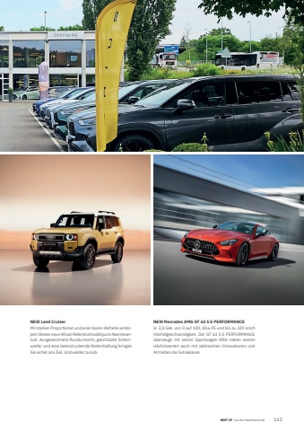 BEST OF Aus der Nachbarschaft BEST OF Portrait xxx 1432NEW Land CruiserMit starken Proportionen und einer klaren %u00c4sthetik verk%u00f6rpert dieses neue Allrad-Referenzmodell pure Abenteuerlust. Ausgezeichnete Rundumsicht, gesch%u00fctzte Scheinwerfer und eine beeindruckende Bodenhaftung bringen Sie sicher ans Ziel. Und wieder zur%u00fcck.NEW Mercedes AMG GT 63 S E PERFORMANCEIn 2,8 Sek. von 0 auf 100, 816 PS und bis zu 320 km/h H%u00f6chstgeschwindigkeit. Der GT 63 S E PERFORMANCE %u00fcberzeugt mit seiner Sportwagen-DNA neben seinen H%u00f6chstwerten auch mit zahlreichen Innovationen und Antrieben der Extraklasse.