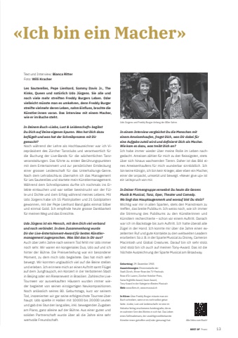 BEST OF BEST OF Promi 132%u00abIch bin ein Macher%u00bbText und Intervie Bianca RitterFoto: Willi KracherLes Sauterelles, Pepe Lienhard, Sammy Davis%u00a0 Jr., The Kinks, Queen und nat%u00fcrlich Udo J%u00fcrgens. Sie alle und noch viele mehr streiften Freddy Burgers Leben. Oder vielleicht m%u00fcsste man es umkehren, denn Freddy Burger streifte vielmehr deren Leben, nahm Einfluss, brachte die K%u00fcnstler:innen voran. Das Interview mit einem Macher, wie er im Buche steht.In Deinem Buch %u00abLiebe, Lust & Leidenschaft%u00bb begibst Du Dich auf Deine eigenen Spuren. Was hat Dich dazu befl%u00fcgelt und was hat der Schreibprozess mit Dir gemacht?Noch w%u00e4hrend der Lehre als Hochbauzeichner war ich Vizepr%u00e4sident des Z%u00fcrcher Tanzclubs und verantwortlich f%u00fcr die Buchung der Live-Bands f%u00fcr die w%u00f6chentlichen Tanzveranstaltungen. Das f%u00fchrte zu ersten Ber%u00fchrungspunkten mit dem Entertainment und zur pers%u00f6nlichen Entdeckung einer grossen Leidenschaft f%u00fcr das Unterhaltungs-Genre. Nach dem Lehrabschluss %u00fcbernahm ich das Management f%u00fcr Les Sauterelles und startete mein K%u00fcnstlermanagement. W%u00e4hrend dem Schreibprozess durfte ich nochmals ins Erlebte eintauchen und war selber beeindruckt von der F%u00fclle und Dichte und dem Erfolg w%u00e4hrend meines Lebens. Mit Udo J%u00fcrgens habe ich 15 Platinplatten und 21 Goldplatten gewonnen, mit der Pepe Lienhard Band gabs einmal Silber und einmal Gold. Ich empfi nde heute grosse Dankbarkeit f%u00fcr meinen Weg und das Erreichte.Udo J%u00fcrgens ist ein Mensch, mit dem Dich viel verband und noch verbindet. In dem Zusammenhang wurde Dir der Live-Entertainment-Award f%u00fcr bestes K%u00fcnstlermanagement zugesprochen. Was l%u00f6st das in Dir aus?Auch %u00fcber zehn Jahre nach seinem Tod fehlt mir Udo immer noch sehr. Wir waren ein kongeniales Duo, Udo auf und ich hinter der B%u00fchne. Die Preisverleihung war ein besonderer Moment, zu dem mich Udo begleitete. Das hat mich sehr bewegt. Wir konnten unglaublich viel auf die Beine stellen und erleben. Ich erinnere mich an einen Auftritt samt Fl%u00fcgel auf dem Jungfraujoch, ein Konzert in der Verbotenen Stadt in Beijing oder ein Riesenevent in Brasilien. Zahlreiche LiveTourneen vor ausverkauften H%u00e4usern wurden immer wieder begleitet von seinen einzigartigen Neukompositionen. Noch anl%u00e4sslich seines 80.%u00a0 Geburtstags, kurz vor seinem Tod, inszenierten wir gar seine erfolgreichste Tournee %u00fcberhaupt. Udo spielte in Hallen mit 10 000 bis 20 000 Leuten und gab drei Stunden lang alles, inkl. bewegenden Zugaben am Piano, ganz alleine auf der B%u00fchne. Aus einer guten und soliden Partnerschaft wurde %u00fcber all die Jahre eine sehr wertvolle Freundschaft.Geburtstag: 29. Dezember 1945Auszeichnungen: Ehrenmedaille der Stadt Z%u00fcrich, Ehren-Rose des TV-Festivals Rose d%u2019Or Luzern, Z%u00fcrcher Hotelier-Preis, Swiss Nightlife Award, Xaver Award, Tony-Award in der Kategorie %u00abBestes Musical%u00bb Web: www.fbm.ch, www.musical.chIn K%u00fcrze: %u00dcber Freddy Burger m%u00fcsste man ein Buch schreiben, wenn er es nicht selbst getan h%u00e4tte. %u00abLiebe, Lust und Leidenschaft%u00bb ist eine im Helvetia-Verlag erschienene Autobiografi e, die es im wahrsten Sinn des Wortes in sich hat. Das Leben eines Selfmademans, der unz%u00e4hlige weltbekannte K%u00fcnstler:innen getroffen und / oder gemanagt hat.In einem Interview vergleichst Du die Menschen mit einem Ameisenhaufen, fragst Dich, was Dir dabei f%u00fcr eine Aufgabe zuteil wird und defi nierst Dich als Macher. Wie kam es dazu, was treibt Dich an?Ich habe immer wieder %u00fcber meine Rolle im Leben nachgedacht. Ameisen z%u00e4hlen f%u00fcr mich zu den fleissigsten, stets %u00fcber sich hinaus wachsenden Tieren. Daher ist das Bild eines Ameisenhaufens f%u00fcr mich wunderbar sinnbildlich. Ich bin keine K%u00f6nigin, ich bin kein Krieger, aber eben ein Macher, einer der anpackt, umsetzt und bewegt. %u00abNever give up%u00bb ist ein Leitspruch von mir.In Deiner Firmengruppe verwebst Du heute die Genres Musik & Musical, Tanz, Oper, Theater und Comedy. Wo liegt das Hauptaugenmerk und worauf bist Du stolz?Wichtig war mir in allen Sparten, stets den Mainstream zu treffen, das breite Publikum. Ich weiss noch, wie ich immer die Stimmung des Publikums zu den K%u00fcnstlerinnen und K%u00fcnstlern recherchierte %u2013 schon vor einem Auftritt. Danach war ich im Backstage bis zum Auftritt. Ich hatte %u00fcberall alle Z%u00fcgel in der Hand. Ich konnte mir %u00fcber die Jahre einen exzellenten Ruf und gute Kontakte zu den weltweiten Leadern erarbeiten: So z. B. in der Sparte Musical zu Disney, Cameron Macintosh und Global Creatures. Darauf bin ich sehr stolz. Und stolz bin ich auch auf meinen Tony-Award. Das ist die h%u00f6chste Auszeichnung der Sparte Musical am Broadway.Udo J%u00fcrgens und Freddy Burger Anfang der 80er-Jahre.Alle Infos zum Buch!