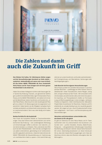 148 BEST OF Aus der NachbarschaftDen R%u00fccken frei halten, f%u00fcr tiefschwarze Zahlen sorgen und bei Herausforderungen beratend zur Seite stehen %u2013 analytisch, bodenst%u00e4ndig und wenns sein muss kritisch: All das bieten NEWO TREUHAND AG ihrer Kundschaft. Maria Mazza und ihr Team bringen sich mit ihrer ganzen Pers%u00f6nlichkeit in die Arbeit ein. Haben Sie es lieber %u00abfadegrad%u00bb n%u00fcchtern oder bevorzugen Sie in Sachen Buchhaltung, Finanzen, und generell bei Geldfragen ausf%u00fchrliche bildhafte Erkl%u00e4rungen? All das bieten Maria Mazza und ihre NEWO TREUHAND AG. %u00abIch stelle mich immer auf die Bed%u00fcrfnisse meiner Kundinnen und Kunden ein%u00bb, erkl%u00e4rt Maria Mazza. %u00abWas braucht er oder sie jetzt gerade? Was gilt es zu kl%u00e4ren?%u00bb Ihr Beratungsansatz ist pragmatisch und pers%u00f6nlich. Dabei besitzt sie die F%u00e4higkeit, komplexe Sachverhalte verst%u00e4ndlich und blitzschnell runterzubrechen. %u00abDas ist matchentscheidend. Denn was viele h%u00e4ufi g nicht haben, ist die Zeit.%u00bb Breites Portfolio f%u00fcr die KundschaftMan fi ndet die komplette Palette an Treuhanddienstleistungen. Etwa das F%u00fchren einer %u00fcbersichtlichen und rechtskonformen Buchhaltung %u2013 %u00abein unabdingbares Werkzeug, um Entscheidungen treffen zu k%u00f6nnen. Und nat%u00fcrlich, um die Administration zu entlasten. Man unterst%u00fctzt die KMU auch bei den Mitarbeitenden. %u00abSie sind das wichtigste Gut von jedem Unternehmen, gleichzeitig ist ein funktionierendes HR unglaublich zeitintensiv.%u00bb Nat%u00fcrlich %u00fcbernehmen die NEWO TREUHAND AG Steuererkl%u00e4rung und -Optimierung, um %u00abrechtskonform Geld zu sparen.%u00bb Und dank Erfahrung Die Zahlen und damitauch die Zukunft im Griff%u00abk%u00f6nnen wir unsere Kundinnen und Kunden optimal beraten%u00a0%u2013 bei Firmengr%u00fcndung- und %u00dcbernahmen, Sanierungen oder Nachfolgeregelungen.%u00bbJede Branche hat ihre eigenen HerausforderungenMaria Mazza punktet mit vertieften Kenntnissen in verschiedensten Branchen %u2013 unabh%u00e4ngig von KMU-Gr%u00f6sse. Etwa im Detailhandel: %u00abViele Transaktionen, kleine Margen, wenig Zeit%u00bb, bringt es Mazza auf den Punkt. %u00abWir entwickeln einfache Konzepte, wie administrativ alles unter einen Hut passt.%u00bb Im Coaching- und Therapiebereich %u00abhelfen wir Terminplanung und Rechnungsstellung in einen einzigen, nahtlosen Prozess zu integrieren.%u00bb Oder in der Baubranche: %u00abBei jedem Projekt fallen Investitionen f%u00fcr Maschinen, Material und Mitarbeitende an und gleichzeitig muss die Liquidit%u00e4t gewahrt werden. Wir zeigen auf wie.%u00bb Auch Privatkundschaft ist bestens aufgehoben %u2013 bei Finanz- und Pensionsplanung oder Steuererkl%u00e4rungen. Menschen und Unternehmen unterscheiden sich, das Gesetz ist f%u00fcr alle gleichEs gibt ein Dilemma mit dem Maria Mazza und ihr Team konfrontiert sind: So unterschiedlich ihre Kundinnen und Kunden sind %u2013 punkto Charakter, Struktur, Bed%u00fcrfnissen, Tempo etc. %u2013 %u00abdie gesetzlichen Anforderungen hinsichtlich Buchf%u00fchrung und Steuern nehmen darauf keine R%u00fccksicht. Wir schon. Gleichzeitig kanalisieren wir diese Individualit%u00e4t so, dass dem Gesetz Rechnung getragen wird. Dass der Abschluss stimmt, dass eine Revision reibungslos %u00fcber die B%u00fchne geht.%u00bb BEST OF Aus der Nachbarschaft