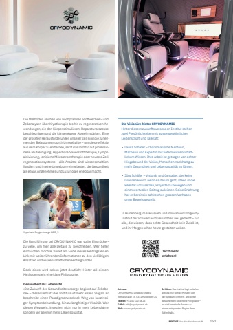 BEST OF Aus der Nachbarschaft BEST OF Portrait xxx 1512Adresse:CRYODYNAMIC Longevity Institut Rothusstrasse 15, 6331 H%u00fcnenberg ZGTelefon: +41 41 510 88 24E-Mail: info@cryodynamic.chWeb: www.cryodynamic.chIn K%u00fcrze: Das Institut liegt verkehrsg%u00fcnstig, nur wenige Minuten von der Autobahn entfernt, und bietet Besuchenden kostenlose Parkpl%u00e4tze %u2013 so wird bereits die Anreise zu einem entspannten Beginn ihres Aufenthalts.Die Methoden reichen von hochpr%u00e4zisen Stoffwechsel- und Zellanalysen %u00fcber Kryotherapie bis hin zu regenerativen Anwendungen, die den K%u00f6rper stimulieren, Reparaturprozesse beschleunigen und die k%u00f6rpereigene Abwehr st%u00e4rken. Eine der gr%u00f6ssten Herausforderungen unserer Zeit sind die zunehmenden Belastungen durch Umweltgifte %u2013 um diese effektiv aus dem K%u00f6rper zu entfernen, setzt das Institut auf professionelle Blutreinigung. Hyperbare Sauerstofftherapie, Lymphaktivierung, ionisierte Mikrostromtherapie oder neueste Zellregenerationssysteme %u2013 alle Ans%u00e4tze sind wissenschaftlich fundiert und in eine Umgebung eingebettet, die Gesundheit als etwas Angenehmes und Luxuri%u00f6ses erlebbar macht.Die Vision%u00e4re hinter CRYODYNAMICHinter diesem zukunftsweisenden Institut stehen zwei Pers%u00f6nlichkeiten mit aussergew%u00f6hnlicher Leidenschaft und Tatkraft:%u2022 Larisa Sch%u00e4fer %u2013 charismatische Mentorin, Macherin und Expertin mit tiefem wissenschaftlichem Wissen. Ihre Arbeit ist getragen von echter Hingabe und der Vision, Menschen nachhaltig zu mehr Gesundheit und Lebensqualit%u00e4t zu f%u00fchren.%u2022 J%u00f6rg Sch%u00e4fer %u2013 Vision%u00e4r und Gestalter, der keine Grenzen kennt, wenn es darum geht, Ideen in die Realit%u00e4t umzusetzen, Projekte zu bewegen und einen wertvollen Beitrag zu leisten. Seine Erfahrung hat er bereits in zahlreichen grossen Vorhaben unter Beweis gestellt.In H%u00fcnenberg im exklusiven und innovativen LongevityInstitut der Schweiz wird Gesundheit neu gedacht %u2013 f%u00fcr alle, die wissen, dass echte Gesundheit kein Zufall ist, und ihr Morgen schon heute gestalten wollen.Die Rundf%u00fchrung bei CRYODYNAMIC war voller Eindr%u00fccke %u2013 zu viele, um hier alle Details zu beschreiben. Wer tiefer eintauchen m%u00f6chte, fi ndet am Ende dieses Beitrags einen Link mit weiterf%u00fchrenden Informationen zu den vielf%u00e4ltigen Ans%u00e4tzen und wissenschaftlichen Hintergr%u00fcnden.Doch eines wird schon jetzt deutlich: Hinter all diesen Methoden steht eine klare Philosophie.Gesundheit als Lebensstil%u00abDie Zukunft der Gesundheitsvorsorge beginnt auf Zellebene%u00bb %u2013 dieser Leitsatz des Instituts ist mehr als ein Slogan. Er beschreibt einen Paradigmenwechsel: Weg von kurzfristiger Symptombehandlung, hin zu langfristiger Vitalit%u00e4t. Wer diesen Weg geht, investiert nicht nur in mehr Lebensjahre, sondern vor allem in mehr Lebensqualit%u00e4t.Hyperbaric Oxygen Lounge LUXO2SJetzt mehr erfahren!