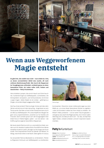 BEST OF Aus der Nachbarschaft BEST OF Portrait xxx 1571Wenn aus Weggeworfenem Magie entstehtAdresse: Patty%u2019s KunterbuntSchmiedgasse 36, 8640 Rapperswil SGTelefon: +41 76 494 12 36E-Mail: patty@pattyskunterbunt.chWeb: www.pattyskunterbunt.chIn K%u00fcrze: Aus Abfall wird Kunst: Patricia Angst verwandelt Kaffeekapseln & Co. in einzigartige Deko und Lampen %u2013 nachhaltig, kreativ und voller Herzblut.Es gibt Orte, die erz%u00e4hlt man nicht %u2013 man erlebt sie. Orte, an denen vermeintlicher Abfall eine zweite, oft noch sch%u00f6nere Bestimmung fi ndet. Wer durch die Rapperswiler Fussg%u00e4ngerzone schlendert, entdeckt genau so einen besonderen Platz: ein Laden voller Licht, Farben und Geschichten %u2013 Patty%u2019s Kunterbunt.Hier entstehen Lampen, die wie ein Hauch von Orient leuchten, funkelnde Engel aus Kaffeekapseln, Lichterketten, die Atmosph%u00e4ren verzaubern, und Schmuckst%u00fccke, die Erinnerungen tragen. Jedes Objekt ist ein Unikat %u2013 gefertigt aus Dingen, die andere l%u00e4ngst weggeworfen h%u00e4tten.Die Frau hinter all dem? Patricia Angst. Schon seit %u00fcber zehn Jahren widmet sie sich dem Upcycling %u2013 lange bevor es zum Trend wurde. Die Idee zu ihren ersten Kreationen kam durch ein Bild aus Kaffeekapseln. Mit unersch%u00f6pflicher Neugier begann sie zu experimentieren, zun%u00e4chst nur f%u00fcr Familie und Freunde. Doch schnell sprach sich die Einzigartigkeit ihrer Arbeit herum. M%u00e4rkte folgten, sp%u00e4ter %u2013 vor drei Jahren %u2013 die Er%u00f6ffnung ihres eigenen Gesch%u00e4fts in Rapperswil.Bis heute steckt Patricia nicht nur unerm%u00fcdliche Arbeit, sondern auch ihr Herzblut in jedem St%u00fcck. Rund 80 % ihrer Werke entstehen direkt im Laden, oft sogar vor den Augen der Kundschaft. Ihre Inspirationen fi ndet sie %u00fcberall: auf Reisen, im Alltag, manchmal mitten in der Nacht. Ideen gehen ihr nie aus.So verwandelt Patricia Bootsseile zu Untersetzern, Perlen zu fi ligranem Schmuck und Kaffeekapseln zu strahlenden Kunstwerken. Menschen reisen mittlerweile sogar aus dem Wallis an, um eines dieser besonderen St%u00fccke zu ergattern %u2013 oder die K%u00fcnstlerin selbst bei ihrer Arbeit zu erleben. Ihr Motto? %u00abAlles probieren %u2013 und an seine Tr%u00e4ume glauben.%u00bb Und genau das macht die Magie sp%u00fcrbar, die in ihrem Laden lebendig wird. Ein Besuch lohnt sich %u2013 f%u00fcr alle, die Nachhaltigkeit lieben, Unikate sch%u00e4tzen und sich inspirieren lassen m%u00f6chten.Patricia Angst