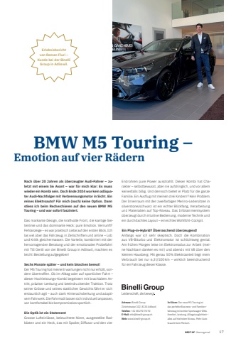 BEST OF BEST OF %u00dcberregional Portrait xxx 172Adresse: Binelli GroupZ%u00fcrichstrasse 102, 8134 AdliswilTelefon: +41 58 270 70 70E-Mail: info@binelli-group.chWeb: www.binelli-group.chIn K%u00fcrze: Der neue M5 Touring ist das perfekte Business- und Familienfahrzeug mit echter Sportwagen-DNA. Komfort, Leistung, Alltagstauglichkeit %u2013 alles auf h%u00f6chstem Niveau. Mehr Auto braucht kein Mensch. BMW M5 Touring %u2013 Emotion auf vier R%u00e4dernNach %u00fcber 20 Jahren als %u00fcberzeugter Audi-Fahrer %u2013 zuletzt mit einem S6 Avant %u2013 war f%u00fcr mich klar: Es muss wieder ein Kombi sein. Doch Ende 2024 war kein ad%u00e4quater Audi-Nachfolger mit Verbrennungsmotor in Sicht. Ein reines Elektroauto? F%u00fcr mich (noch) keine Option. Dann stiess ich beim Recherchieren auf den neuen BMW M5 Touring %u2013 und war sofort fasziniert. Das markante Design, die kraftvolle Front, die kantige Seitenlinie und das dominante Heck: pure Emotion. Vernunft? Fehlanzeige %u2013 es war praktisch Liebe auf den ersten Blick. Ich las viel %u00fcber das Fahrzeug, in Zeitschriften und online %u2013 Lob und Kritik gleichermassen. Die Vorteile, kombiniert mit der hervorragenden Beratung und der emotionalen Probefahrt mit Till Oertli von der Binelli Group in Adliswil, machten es leicht: Bestellung aufgegeben!Sechs Monate sp%u00e4ter %u2013 und kein bisschen bereut!Der M5 Touring hat meine Erwartungen nicht nur erf%u00fcllt, sondern %u00fcbertroffen. Ob im Alltag oder auf sportlicher Fahrt %u2013 dieser Hochleistungs-Kombi begeistert mit brachialem Antritt, pr%u00e4ziser Lenkung und beeindruckender Traktion. Trotz seiner Gr%u00f6sse und seines stattlichen Gewichts f%u00e4hrt er sich erstaunlich agil %u2013 auch dank Hinterachslenkung und adaptivem Fahrwerk. Die Fahrmodi lassen sich individuell anpassen, von komfortabel bis kompromisslos sportlich.Die Optik ist ein StatementGrosse Lufteinl%u00e4sse, beleuchtete Niere, ausgestellte Radk%u00e4sten und ein Heck, das mit Spoiler, Diffusor und den vier Endrohren pure Power ausstrahlt. Dieser Kombi hat Charakter %u2013 selbstbewusst, aber nie aufdringlich, und vor allem keinesfalls billig. Und dennoch bietet er Platz f%u00fcr die ganze Familie. Ein Ausflug mit meinen drei Kindern? Kein Problem. Der Innenraum mit den zweifarbigen Merino-Ledersitzen in silverstone/schwarz ist ein echter Blickfang, Verarbeitung und Materialien auf Top-Niveau. Das Infotainmentsystem %u00fcberzeugt durch intuitive Bedienung, moderne Technik und ein durchdachtes Layout %u2013 ein echtes Wohlf%u00fchl-Cockpit.Ein Plug-in-Hybrid? %u00dcberraschend %u00fcberzeugend!Anfangs war ich sehr skeptisch. Doch die Kombination aus V8-Biturbo und Elektromotor ist schlichtweg genial. Am fr%u00fchen Morgen leise im Elektromodus zur Arbeit (meine Nachbarn danken es mir) und abends mit V8 %u00fcber den kleinen Hausberg. Mit genau 50 % Elektroanteil liegt mein Verbrauch bei nur 6,3 l /100 km %u2013 wirklich beeindruckend f%u00fcr ein Fahrzeug dieser Klasse.Erlebnis bericht von Roman Fluri %u2013 Kunde bei der Binelli Group in Adliswil.