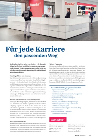 BEST OF BEST OF %u00dcberregional Stadt Z%u00fcrich 214F%u00fcr jede Karriere den passenden WegAdresse: Benedict Schule Z%u00fcrichVulkanstrasse 106, 8048 Z%u00fcrichTelefon: +41 44 242 12 60E-Mail: info.zh@benedict.chWeb: www.benedict.chIn K%u00fcrze: Erfolg ist lernbar! Benedict bietet an zentralen Standorten in Z%u00fcrich, Luzern, Bern und St. Gallen ein spannendes Bildungsangebot mit anerkannten Abschl%u00fcssen an.Ob Einstieg, Aufstieg oder Quereinstieg %u2013 die Benedict Schule hat f%u00fcr jede berufliche Herausforderung das passende Angebot. Von den kompakten und praxisorientierten Lehrg%u00e4ngen profi tieren alle, die sich gezielt und individuell weiterbilden m%u00f6chten.Viele Wege f%u00fchren zum AbschlussEgal ob bessere Karrierechancen, ein effi zienter Quereinstieg in einen neuen Beruf oder alternative Wege f%u00fcr Schulabg%u00e4nger:innen %u2013 die Benedict Schule bietet f%u00fcr alle Anforderungen und Zielsetzungen den passenden Lehrgang. Neben berufsbegleitenden Weiterbildungen stehen auch Alternativen zur klassischen Berufslehre auf dem Programm. Diese schulisch organisierten Grundbildungen in den Bereichen KV, Informatik und Medizin werden mit einem eidgen%u00f6ssischen F%u00e4higkeitszeugnis (EFZ) abgeschlossen und stehen einer Berufslehre in nichts nach. National und international anerkannte DiplomeHR, Digital Marketing, Logistik, Medizin, Betriebswirtschaft und Informatik sind Teil des Angebots, das durch weitere Lehrg%u00e4nge erg%u00e4nzt wird. Auch bei den Abschl%u00fcssen ist die Schule breit aufgestellt. Zu den anerkannten Diplomen, die bei Benedict erlangt werden k%u00f6nnen, geh%u00f6ren Sprachdiplome, der eidgen%u00f6ssische Fachausweis, das EFZ, diverse Verbandsdiplome (z. B. B%u00fcrofachdiplom VSH, H%u00f6here Wirtschaftsdiplom VSK/HWD u. a.), der Bachelor of Arts in Business Administration und der Master of Science in Business Management.Hohe Qualit%u00e4tsstandardsBei Benedict unterrichten akkreditierte Lehrkr%u00e4fte mit Universit%u00e4ts- oder Fachhochschulabschluss und fundierter p%u00e4da gogischer Erfahrung. Neben ihrer Lehrt%u00e4tigkeit %u00fcben die Dozierenden beruflich eine Fach- und F%u00fchrungsfunktion aus, was eine praxisnahe Wissensvermittlung erm%u00f6glicht.Weitere PluspunkteWer sich an der Benedict weiterbildet, profi tiert von kostenlosen Wahlf%u00e4chern wie Sprachkursen. Dar%u00fcber hinaus bietet die Schule eine umfassende und kostenlose Bildungs- und Laufbahnberatung an, in der das pers%u00f6nliche Lernprofi l entsprechend den individuellen Neigungen und Zielen erarbeitet wird. Weitere Pluspunkte sind die flexiblen Zahlungs- und Darlehensmodalit%u00e4ten, die eine individuelle Bildungsfi nanzierung erm%u00f6glichen. Am Standort Z%u00fcrich sorgt das hauseigene Restaurant PIAZZA 106 f%u00fcr Abwechslung auf dem Teller.Aus- und Weiterbildungsangebote im %u00dcberblick%u2022 Sprachschule mit Gruppen-, Einzelund Online-Kursen%u2022 Handelsschule, Betriebswirtschaft, Management%u2022 Informatik, ICT, Digital Marketing %u2022 Cyber Security, K%u00fcnstliche Intelligenz, Entrepreneurship%u2022 Medizin, Gesundheit, Ern%u00e4hrung, Massage%u2022 Vorbereitungskurse f%u00fcr eidg. Fachausweise und h%u00f6here Fachpr%u00fcfungen%u2022 Schulische Grundbildung (KV, Informatik, MPA) und 10. Schuljahr%u2022 Berufsmaturit%u00e4t BM 2, Bachelorund Masterstudieng%u00e4nge