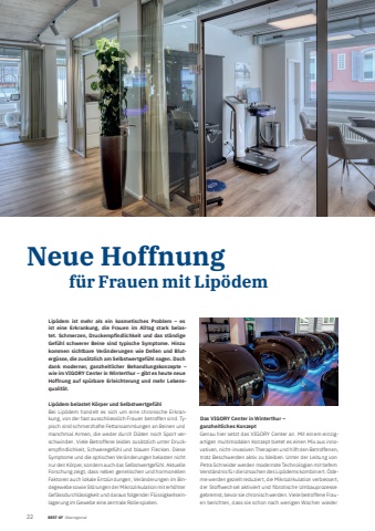 221 BEST OF BEST OF %u00dcberregional Portrait xxxNeue Hoffnung f%u00fcr Frauen mit Lip%u00f6demLip%u00f6dem ist mehr als ein kosmetisches Problem %u2013 es ist eine Erkrankung, die Frauen im Alltag stark belastet. Schmerzen, Druckempfi ndlichkeit und das st%u00e4ndige Gef%u00fchl schwerer Beine sind typische Symptome. Hinzu kommen sichtbare Ver%u00e4nderungen wie Dellen und Bluterg%u00fcsse, die zus%u00e4tzlich am Selbstwertgef%u00fchl nagen. Doch dank moderner, ganzheitlicher Behandlungskonzepte %u2013 wie im VIGORY Center in Winterthur %u2013 gibt es heute neue Hoffnung auf sp%u00fcrbare Erleichterung und mehr Lebensqualit%u00e4t.Lip%u00f6dem belastet K%u00f6rper und Selbstwertgef%u00fchlBei Lip%u00f6dem handelt es sich um eine chronische Erkrankung, von der fast ausschliesslich Frauen betroffen sind. Typisch sind schmerzhafte Fettansammlungen an Beinen und manchmal Armen, die weder durch Di%u00e4ten noch Sport verschwinden. Viele Betroffene leiden zus%u00e4tzlich unter Druckempfi ndlichkeit, Schweregef%u00fchl und blauen Flecken. Diese Symptome und die optischen Ver%u00e4nderungen belasten nicht nur den K%u00f6rper, sondern auch das Selbstwertgef%u00fchl. Aktuelle Forschung zeigt, dass neben genetischen und hormonellen Faktoren auch lokale Entz%u00fcndungen, Ver%u00e4nderungen im Bindegewebe sowie St%u00f6rungen der Mikrozirkulation mit erh%u00f6hter Gef%u00e4ssdurchl%u00e4ssigkeit und daraus folgender Fl%u00fcssigkeitseinlagerung im Gewebe eine zentrale Rolle spielen. Das VIGORY Center in Winterthur %u2013 ganzheitliches KonzeptGenau hier setzt das VIGORY Center an. Mit einem einzigartigen multimodalen Konzept bietet es einen Mix aus innovativen, nicht-invasiven Therapien und hilft den Betroffenen, trotz Beschwerden aktiv zu bleiben. Unter der Leitung von Petra Schneider werden modernste Technologien mit tiefem Verst%u00e4ndnis f%u00fcr die Ursachen des Lip%u00f6dems kombiniert. %u00d6deme werden gezielt reduziert, die Mikrozirkulation verbessert, der Stoffwechsel aktiviert und fi brotische Umbauprozesse gebremst, bevor sie chronisch werden. Viele betroffene Frauen berichten, dass sie schon nach wenigen Wochen wieder