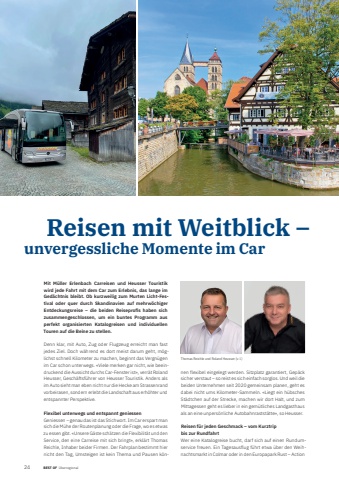241 BEST OF BEST OF %u00dcberregional Portrait xxx Reisen mit Weitblick %u2013 unvergessliche Momente im CarMit M%u00fcller Erlenbach Carreisen und Heusser Touristik wird jede Fahrt mit dem Car zum Erlebnis, das lange im Ged%u00e4chtnis bleibt. Ob kurzweilig zum Murten Licht-Festival oder quer durch Skandinavien auf mehrw%u00f6chiger Entdeckungsreise %u2013 die beiden Reiseprofi s haben sich zusammengeschlossen, um ein buntes Programm aus perfekt organisierten Katalogreisen und individuellen Touren auf die Beine zu stellen.Denn klar, mit Auto, Zug oder Flugzeug erreicht man fast jedes Ziel. Doch w%u00e4hrend es dort meist darum geht, m%u00f6glichst schnell Kilometer zu machen, beginnt das Vergn%u00fcgen im Car schon unterwegs. %u00abViele merken gar nicht, wie beeindruckend die Aussicht durchs Car-Fenster ist%u00bb, verr%u00e4t Roland Heusser, Gesch%u00e4ftsf%u00fchrer von Heusser Touristik. Anders als im Auto sieht man eben nicht nur die Hecke am Strassenrand vorbeirasen, sondern erlebt die Landschaft aus erh%u00f6hter und entspannter Perspektive.Flexibel unterwegs und entspannt geniessenGeniessen %u2013 genau das ist das Stichwort. Im Car erspart man sich die M%u00fche der Routenplanung oder die Frage, wo es etwas zu essen gibt. %u00abUnsere G%u00e4ste sch%u00e4tzen die Flexibilit%u00e4t und den Service, den eine Carreise mit sich bringt%u00bb, erkl%u00e4rt Thomas Reichle, Inhaber beider Firmen. Der Fahrplan bestimmt hier nicht den Tag, Umsteigen ist kein Thema und Pausen k%u00f6nnen flexibel eingelegt werden. Sitzplatz garantiert, Gep%u00e4ck sicher verstaut %u2013 so reist es sich einfach sorglos. Und weil die beiden Unternehmen seit 2020 gemeinsam planen, geht es dabei nicht ums Kilometer-Sammeln. %u00abLiegt ein h%u00fcbsches St%u00e4dtchen auf der Strecke, machen wir dort Halt, und zum Mittagessen geht es lieber in ein gem%u00fctliches Landgasthaus als an eine unpers%u00f6nliche Autobahnrastst%u00e4tte%u00bb, so Heusser.Reisen f%u00fcr jeden Geschmack %u2013 vom Kurztrip bis zur RundfahrtWer eine Katalogreise bucht, darf sich auf einen Rundumservice freuen. Ein Tagesausflug f%u00fchrt etwa %u00fcber den Weihnachtsmarkt in Colmar oder in den Europapark Rust %u2013 Action Thomas Reichle und Roland Heusser (v. l.)