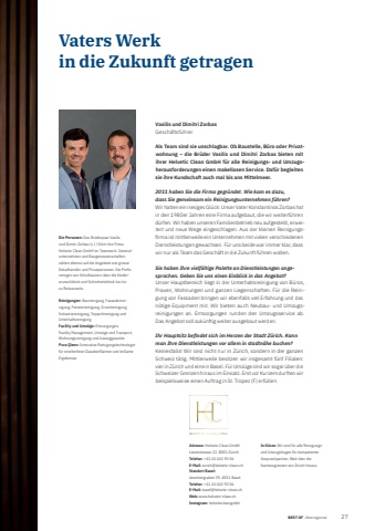 BEST OF BEST OF %u00dcberregional Interview 272Die Personen: Das Br%u00fcderpaar Vasilis und Dimitri Zorbas (v. l.) f%u00fchrt ihre Firma Helvetic Clean GmbH im Teamwork. Generalunternehmen und Baugenossenschaften z%u00e4hlen ebenso auf die Angebote wie grosse Detailh%u00e4ndler und Privatpersonen. Die Profi s reinigen von Schulh%u00e4usern %u00fcber die Kinderwunschklinik und Sch%u00f6nheitsklinik bis hin zu Restaurants.Reinigungen: Baureinigung, Fassadenreinigung, Fensterreinigung, Grundreinigung, Industriereinigung, Teppichreinigung und UnterhaltsreinigungFacility und Umz%u00fcge: Entsorgungen, Facility Management, Umz%u00fcge und Transport, Wohnungsreinigung und AuszuggarantiePura Qleen: Innovative Reinigungstechnologie f%u00fcr streifenfreie Glasoberfl%u00e4chen und brillante ErgebnisseVasilis und Dimitri ZorbasGesch%u00e4ftsf%u00fchrerAls Team sind sie unschlagbar. Ob Baustelle, B%u00fcro oder Privatwohnung %u2013 die Br%u00fcder Vasilis und Dimitri Zorbas bieten mit ihrer Helvetic Clean GmbH f%u00fcr alle Reinigungs- und Umzugsherausforderungen einen makellosen Service. Daf%u00fcr begleiten sie ihre Kundschaft auch mal bis ans Mittelmeer. 2011 haben Sie die Firma gegr%u00fcndet. Wie kam es dazu, dass Sie gemeinsam ein Reinigungsunternehmen f%u00fchren?Wir hatten ein riesiges Gl%u00fcck: Unser Vater Konstantinos Zorbas hat in den 1980er Jahren eine Firma aufgebaut, die wir weiterf%u00fchren d%u00fcrfen. Wir haben unseren Familienbetrieb neu aufgestellt, erweitert und neue Wege eingeschlagen. Aus der kleinen Reinigungsfi rma ist mittlerweile ein Unternehmen mit vielen verschiedenen Dienstleistungen gewachsen. F%u00fcr uns beide war immer klar, dass wir nur als Team das Gesch%u00e4ft in die Zukunft f%u00fchren wollen. Sie haben Ihre vielf%u00e4ltige Palette an Dienstleistungen angesprochen. Geben Sie uns einen Einblick in das Angebot?Unser Hauptbereich liegt in der Unterhaltsreinigung von B%u00fcros, Praxen, Wohnungen und ganzen Liegenschaften. F%u00fcr die Reinigung von Fassaden bringen wir ebenfalls viel Erfahrung und das n%u00f6tige Equipment mit. Wir bieten auch Neubau- und Umzugsreinigungen an. Entsorgungen runden den Umzugsservice ab. Das Angebot soll zuk%u00fcnftig weiter ausgebaut werden.Ihr Hauptsitz befi ndet sich im Herzen der Stadt Z%u00fcrich. Kann man Ihre Dienstleistungen vor allem in stadtn%u00e4he buchen?Keinesfalls! Wir sind nicht nur in Z%u00fcrich, sondern in der ganzen Schweiz t%u00e4tig. Mittlerweile besitzen wir insgesamt f%u00fcnf Filialen: vier in Z%u00fcrich und eine in Basel. F%u00fcr Umz%u00fcge sind wir sogar %u00fcber die Schweizer Grenzen hinaus im Einsatz. Erst vor Kurzem durften wir beispielsweise einen Auftrag in St. Tropez (F) erf%u00fcllen.Vaters Werk in die Zukunft getragenAdresse: Helvetic Clean GmbHL%u00f6wenstrasse 22, 8001 Z%u00fcrichTelefon: +41 43 443 93 56E-Mail: zurich@helvetic-clean.chStandort Basel:Aeschengraben 29, 4051 BaselTelefon: +41 43 443 93 56E-Mail: basel@helvetic-clean.chWeb: www.helvetic-clean.chInstagram: helveticcleangmbhIn K%u00fcrze: Wir sind f%u00fcr alle Reinigungsund Umzugsfragen Ihr kompetenter Ansprechpartner. Weit %u00fcber die Kantonsgrenzen von Z%u00fcrich hinaus.