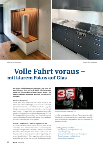 281 BEST OF BEST OF %u00dcberregional Portrait xxx Volle Fahrt voraus %u2013 mit klarem Fokus auf GlasIm Herbst 2024 hiess es noch: %u00abVollgas %u2013 aber nicht auf dem Holzweg.%u00bb Jetzt geht es f%u00fcr die 3S-Schreinerservice GmbH mit gleichem Elan auf dem Glasweg weiter %u2013 mit beeindruckendem Know-how, Pr%u00e4zision und viel Nachhaltigkeit.Glasklare KompetenzDaniel Bachmann, Mitgr%u00fcnder der Firma, bringt es auf den Punkt: %u00abWir wollen zeigen, wie viel Glas in unserem Schreiner service steckt.%u00bb Ob defekte Duschw%u00e4nde, kaputte Spiegel, zerbrochene K%u00fcchenglasr%u00fcckw%u00e4nde oder besch%u00e4digte Fenster %u2013 3S ist zur Stelle, wenn es darauf ankommt. Besonders stolz ist das Team darauf, alte Bausubstanz, T%u00fcr- und Fensterglas stilgerecht zu erhalten, statt einfach alles neu zu machen. So bleiben Charme und Charakter eines Geb%u00e4udes erhalten %u2013 nachhaltig und sch%u00f6n zugleich.Schnell %u2013 professionell %u2013 meist in Tagesfrist vor OrtEin Glasbruch? Kein Problem. Das 3S-Team ist rasch vor Ort, sichert die Stelle mit Schutzfolie oder einer Schichtplatte und organisiert gleich den passenden Ersatz. Die Kundschaft bekommt schnellstm%u00f6glich einen Termin f%u00fcr das Finale der Reparatur. Oft ist das Anliegen am selben Tag erledigt. Bei einem Notfall ist das 3S-Team sogar innerhalb von einer bis zu drei Stunden vor Ort und kann mit der Reparatur beginnen. Die top ausgestatteten Service-Fahrzeuge sind mobile Werkst%u00e4tten, mit denen die Monteure unabh%u00e4ngig und effi zient arbeiten k%u00f6nnen %u2013 ganz egal von welchem Hersteller die Bauteile stammen. Daniel Bachmann und Gil Hegetschweiler (v. l.)Leistungen rund ums Glas:%u2022 Notverglasung, Isolierglas-Ersatz und Doppelverglasung %u2022 Schaufenster, Schiebet%u00fcren und Wintergarten%u2022 Spiegelmontagen und Badezimmersowie K%u00fcchenverglasungGarderobe mit Holzverkleidung K%u00fcche mit neuer Glasr%u00fcckwand