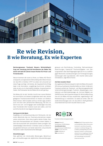 321 BEST OF BEST OF %u00dcberregional Portrait xxx Re wie Revision, B wie Beratung, Ex wie ExpertenRechnungswesen, Treuhand, Steuern, Wirtschaftspr%u00fcfung und -beratung sind die Kernthemen der Rebex AG, einem seit bald 30 Jahren treuen Partner f%u00fcr Privat- und Firmenkunden.Warum kommen die Leute zu Ihnen, zur Rebex AG? Revisionsexperte und diplomierter Wirtschaftspr%u00fcfer Alfons Florian, der das KMU in Dietikon 1997 ins Leben rief, antwortet auf diese Frage wie folgt: %u00abIch denke, der haupts%u00e4chliche Erfolg liegt in der Konsistenz. Langj%u00e4hrige Kund:innen sch%u00e4tzen, dass sie bei uns im Normalfall dieselben Ansprechpartner haben. Die Fluktuation bei der Rebex AG ist sehr gering.%u00bb Die Rebex AG ist sehr famili%u00e4r, Kund:innen sowie Mitarbeiter:innen f%u00fchlen sich bestens aufgehoben beim sehr zentral gelegenen Treuhandunternehmen im Herzen von Dietikon. Alfons Florian: %u00abWir trumpfen nicht nur mit der Lage, sondern auch mit einer sehr pers%u00f6nlichen Betreuung, hier bei uns kennt man sich. Und entgegen dem landl%u00e4ufi gen Vorurteil, dass Treuh%u00e4nder eher trockene Leute sein sollen, wird hier auf erfrischende Art das Gegenteil bewiesen.Vertrauen ist die BasisSorgf%u00e4ltig und vertrauensw%u00fcrdig sind Stichworte, die bei einem Beschrieb %u00fcber ein Treuhandunternehmen idealerweise vorkommen. Denn darum gehts letzten Endes. Man baut eine Vertrauensbasis auf. Gerade in einem Gebiet, in dem die Kundschaft sehr pers%u00f6nliche Daten preisgibt. Das siebenk%u00f6pfi ge Unternehmen in Dietikon weiss um dieses in sie gesetzte Vertrauen und ber%u00e4t nat%u00fcrliche und juristische Personen in allen treuh%u00e4nderischen Belangen.DienstleistungenDazu geh%u00f6ren die individuellen Beratungen, Berechnungen und Ausf%u00fchrungen der allj%u00e4hrlichen Steuererkl%u00e4rungen genauso wie Buchhaltung, Controlling, MehrwertsteuerAbrechnungen, klassische Treuhandaufgaben vom Zahlungsverkehr %u00fcber Nachfolgeregelungen bis hin zu unabh%u00e4ngigen Revisionen, Sonderpr%u00fcfungen und Firmengr%u00fcndungen, Sanierungen oder Liquidationen. %u00abWir machen alles ausser Immobilien%u00bb, sagt Alfons Florian.Auf dem neusten StandAls zugelassene Revisionsexpertin steht die Rebex AG sowohl KMU als auch gr%u00f6sseren Gesellschaften zur Seite. Im Bereich Treuhand wickelt die Treuhand- und Revisionsgesellschaft Unternehmensgr%u00fcndungen, Fusionen, Abspaltungen, Liquidationen und Rechtsberatungen ab. Und als Mitglied von EXPERTsuisse, dem Expertenverband f%u00fcr Wirtschafspr%u00fcfung, hat sich die Rebex AG dazu verpflichtet, regelm%u00e4ssig in die Weiterbildung zu investieren. So stellt sie sicher, %u00fcber aktuelle Entwicklungen wie z. B. das 2023 in Kraft getretene neue Aktienrecht auf dem neusten Stand zu sein.Adresse: Rebex AGZentralstrasse 19, 8953 DietikonGesch%u00e4ftsstelle Z%u00fcrich:Baumackerstrasse 24, 8050 Z%u00fcrichTelefon: +41 44 744 76 76E-Mail: info@rebex.chWeb: www.rebex.chIn K%u00fcrze: Bald 30 Jahre ber%u00e4t das Team um Gesch%u00e4ftsf%u00fchrer Alfons Florian seine Kundschaft in s%u00e4mtlichen fi nanziellen und (steuer-)rechtlichen Belangen. Die in Dietikon ans%u00e4ssige Rebex AG ist eine klassische Treuhand- und Revisionsgesellschaft, die mit langj%u00e4hriger Erfahrung und breiter, fundierter Ausbildung auf alle Treuhandfragen die passenden Antworten bereit h%u00e4lt.
