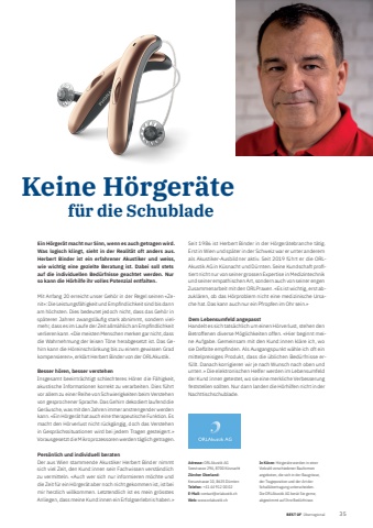 BEST OF BEST OF %u00dcberregional Portrait xxx 351Keine H%u00f6rger%u00e4te f%u00fcr die SchubladeAdresse: ORLAkustik AGSeestrasse 29A, 8700 K%u00fcsnachtZ%u00fcrcher Oberland:Kreuzstrasse 10, 8635 D%u00fcrntenTelefon: +41 44 912 00 02E-Mail: contact@orlakustik.chWeb: www.orlakustik.chIn K%u00fcrze: H%u00f6rger%u00e4te werden in einer Vielzahl verschiedener Bauformen angeboten, die sich in der Baugr%u00f6sse, der Trageposition und der Art der Schall%u00fcbertragung unterscheiden. Die ORLAkustik AG ber%u00e4t Sie gerne, abgestimmt auf Ihre Bed%u00fcrfnisse.Ein H%u00f6rger%u00e4t macht nur Sinn, wenn es auch getragen wird. Was logisch klingt, sieht in der Realit%u00e4t oft anders aus. Herbert Binder ist ein erfahrener Akustiker und weiss, wie wichtig eine gezielte Beratung ist. Dabei soll stets auf die individuellen Bed%u00fcrfnisse geachtet werden. Nur so kann die H%u00f6rhilfe ihr volles Potenzial entfalten. Mit Anfang 20 erreicht unser Geh%u00f6r in der Regel seinen %u00abZenit%u00bb: Die Leistungsf%u00e4higkeit und Empfi ndlichkeit sind bis dann am h%u00f6chsten. Dies bedeutet jedoch nicht, dass das Geh%u00f6r in sp%u00e4teren Jahren zwangsl%u00e4ufi g stark abnimmt, sondern vielmehr, dass es im Laufe der Zeit allm%u00e4hlich an Empfi ndlichkeit verlieren kann. %u00abDie meisten Menschen merken gar nicht, dass die Wahrnehmung der leisen T%u00f6ne herabgesetzt ist. Das Gehirn kann die H%u00f6reinschr%u00e4nkung bis zu einem gewissen Grad kompensieren%u00bb, erkl%u00e4rt Herbert Binder von der ORLAkustik. Besser h%u00f6ren, besser verstehenInsgesamt beeintr%u00e4chtigt schlechteres H%u00f6ren die F%u00e4higkeit, akustische Informationen korrekt zu verarbeiten. Dies f%u00fchrt vor allem zu einer Reihe von Schwierigkeiten beim Verstehen von gesprochener Sprache. Das Gehirn dekodiert laufend die Ger%u00e4usche, was mit den Jahren immer anstrengender werden kann. %u00abEin H%u00f6rger%u00e4t hat auch eine therapeutische Funktion. Es macht den H%u00f6rverlust nicht r%u00fcckg%u00e4ngig, doch das Verstehen in Gespr%u00e4chssituationen wird bei jedem Tragen gesteigert.%u00bb Vorausgesetzt die Mikroprozessoren werden t%u00e4glich getragen. Pers%u00f6nlich und individuell beratenDer aus Wien stammende Akustiker Herbert Binder nimmt sich viel Zeit, den Kund:innen sein Fachwissen verst%u00e4ndlich zu vermitteln. %u00abAuch wer sich nur informieren m%u00f6chte und die Zeit f%u00fcr ein H%u00f6rger%u00e4t aber noch nicht gekommen ist, ist bei mir herzlich willkommen. Letztendlich ist es mein gr%u00f6sstes Anliegen, dass meine Kund:innen ein Erfolgserlebnis haben.%u00bbSeit 1986 ist Herbert Binder in der H%u00f6rger%u00e4tebranche t%u00e4tig. Erst in Wien und sp%u00e4ter in der Schweiz war er unter anderem als Akustiker-Ausbildner aktiv. Seit 2019 f%u00fchrt er die ORLAkustik AG in K%u00fcsnacht und D%u00fcrnten. Seine Kundschaft profi -tiert nicht nur von seiner grossen Expertise in Medizintechnik und seiner empathischen Art, sondern auch von seiner engen Zusammenarbeit mit den ORLPraxen. %u00abEs ist wichtig, erst abzukl%u00e4ren, ob das H%u00f6rproblem nicht eine medizinische Ursache hat. Das kann auch nur ein Pfropfen im Ohr sein.%u00bb Dem Lebensumfeld angepasstHandelt es sich tats%u00e4chlich um einen H%u00f6rverlust, stehen den Betroffenen diverse M%u00f6glichkeiten offen. %u00abHier beginnt meine Aufgabe. Gemeinsam mit den Kund:innen kl%u00e4re ich, wo sie Defi zite empfi nden. Als Ausgangspunkt w%u00e4hle ich oft ein mittelpreisiges Produkt, dass die %u00fcblichen Bed%u00fcrfnisse erf%u00fcllt. Danach korrigieren wir je nach Wunsch nach oben und unten.%u00bb Die elektronischen Helfer werden im Lebensumfeld der Kund:innen getestet, wo sie eine merkliche Verbesserung feststellen sollten. Nur dann landen die H%u00f6rhilfen nicht in der Nachttischschublade.