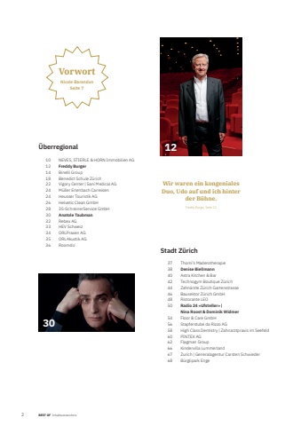 2 BEST OF Inhaltsverzeichnis%u00dcberregional10 NEVES, STIERLE & HORN Immobilien AG12 Freddy Burger14 Binelli Group18 Benedict Schule Z%u00fcrich22 Vigory Center | Sani Medical AG24 M%u00fcller Erlenbach Carreisen24 Heusser Touristik AG26 Helvetic Clean GmbH28 3S-SchreinerService GmbH30 Anatole Taubman32 Rebex AG33 HEV Schweiz34 ORLPraxen AG35 ORLAkustik AG36 Room4UStadt Z%u00fcrich37 Thomi%u2019s Maderotherapie38 Denise Biellmann40 Astra Kitchen & Bar42 Technogym Boutique Z%u00fcrich44 Zahn%u00e4rzte Z%u00fcrich Gartenstrasse46 Bausektor Z%u00fcrich GmbH48 Ristorante LEO50 Radio 24 %u00abUfsteller%u00bb | Nina Roost & Dominik Widmer54 Floor & Care GmbH56 Stapferstube da Rizzo AG58 High Class Dentistry | Zahnarztpraxis im Seefeld60 PINTEX AG62 Flagman Group66 Kindervilla Lummerland67 Zurich | Generalagentur Carsten Schwieder68 B%u00fcrglipark Enge12Wir waren ein kongeniales Duo, Udo auf und ich hinter der B%u00fchne. Freddy Burger, Seite 12VorwortNicole BarandunSeite 730
