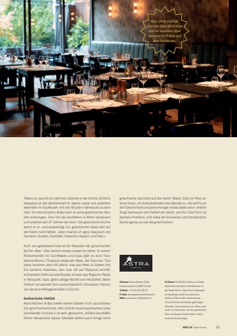 BEST OF Stadt Z%u00fcrich 412Adresse: Astra Kitchen & Bar L%u00f6wenstrasse 25, 8001 Z%u00fcrichTelefon: +41 44 544 00 73E-Mail: astra@astra-kitchenbar.chWeb: www.astra-kitchenbar.chIn K%u00fcrze: Die Br%u00fcder Stelios und Seigi Sterkoudis sind keine Unbekannten in der Stadt Z%u00fcrich. Nach ihrem Gastspiel im Kaufleuten steht nun das Astra Kitchen & Bar an der L%u00f6wenstrasse 25 im Zentrum der beiden geb%u00fcrtigen Griechen. Sie verzaubern vor allem, aber nicht nur, Menschen, die das griechische Flair und dessen K%u00fcche lieben. Schon heute ein Geheimtipp.Tellern zu sp%u00fcren ist, steht ein Grieche in der K%u00fcche. Dimitris Kiapekos ist der K%u00fcchenchef im Szene-Lokal und arbeitete ebenfalls im Kaufleuten mit den Br%u00fcdern Sterkoudis zusammen. Im Astra Kitchen & Bar kann er seine griechischen Wurzeln einbringen. Dimi hat die Kochlehre in Athen absolviert und arbeitet seit 27 Jahren als Koch. Die griechische K%u00fcche kennt er in- und auswendig. Ein griechischer Salat darf auf der Karte nicht fehlen. %u00abDen mache ich ganz klassisch mit Tomaten, Gurken, Zwiebeln, Peperoni, Kapern und Feta.%u00bb Auch der gebackene Feta ist ein Klassiker der griechischen K%u00fcche. Aber: %u00abDer kommt etwas moderner daher. In einem Pankomantel mit Cornflakes und dazu gibt es eine Traubenkonfi t%u00fcre.%u00bb Thalassa bedeutet Meer, die Paccheri Thalassa kommen also mit allem, was das Meer zu bieten hat. Ein weiterer Klassiker, den man oft auf Mykonos antrifft: Kritharotto! Sieht aus wie Risotto, ist aber aus fi ligraner Pasta in Reisoptik. Dazu gibts saftige W%u00fcrfel vom Rindsfi let. Beim Fleisch verwendet Dimi ausschliesslich Schweizer Fleisch von der Kult-Metzgerei Keller in Z%u00fcrich.Kulinarische VielfaltAstra Kitchen & Bar bietet seinen G%u00e4sten nicht ausschliesslich griechische K%u00fcche. %u00abWir sind ein kosmopolitisches Lokal. Die Klientel im Kreis 1 ist sehr gemischt%u00bb, erkl%u00e4rt Gesch%u00e4ftsf%u00fchrer Alexandros Vasios. Deshalb stehen auch einige nichtgriechische Gerichte auf der Karte: Black Cod mit Miso an einer Dashi, ein Kalbskotelette oder Bao Buns. %u00abEs soll f%u00fcr jeden Geschmack und jeden Hunger etwas dabei sein%u00bb, erkl%u00e4rt Seigi Sterkoudis die Vielfalt der Karte. Und f%u00fcr Chef Dimi ist das kein Problem. %u00abIch liebe die Schweizer und franz%u00f6sische K%u00fcche genau so wie die griechische!%u00bbDas Lokal verf%u00fcgt drinnen %u00fcber 85 Pl%u00e4tze und im Sommer %u00fcber weitere 42 Pl%u00e4tze auf den Terrassen.BEST OF Stadt Z%u00fcrich