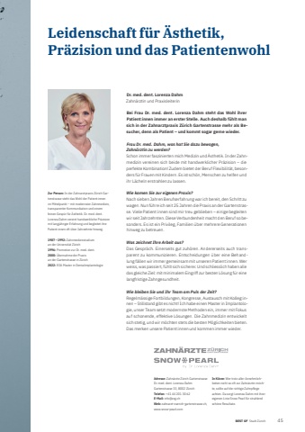 BEST OF BEST OF Stadt Z%u00fcrich Interview 452Leidenschaft f%u00fcr %u00c4sthetik, Pr%u00e4zision und das PatientenwohlAdresse: Zahn%u00e4rzte Z%u00fcrich GartenstrasseDr. med. dent. Lorenza DahmGartenstrasse 33, 8002 Z%u00fcrichTelefon: +41 44 201 30 62E-Mail: info@zzg.chWeb: zahnarzt-zuerich-gartenstrasse.ch, www.snow-pearl.comIn K%u00fcrze: Wer trotz aller Annehmlichkeiten nicht so oft zur Zahn%u00e4rztin m%u00f6chte, sollte auf die richtige Zahnpflege achten. Da sorgt Lorenza Dahm mit ihrer eigenen Linie Snow Pearl f%u00fcr strahlend sch%u00f6ne Resultate.Dr. med. dent. Lorenza DahmZahn%u00e4rztin und PraxisleiterinBei Frau Dr. med. dent. Lorenza Dahm steht das Wohl ihrer Patient:innen immer an erster Stelle. Auch deshalb f%u00fchlt man sich in der Zahnarztpraxis Z%u00fcrich Gartenstrasse mehr als Besucher, denn als Patient %u2013 und kommt sogar gerne wieder.Frau Dr. med. Dahm, was hat Sie dazu bewogen, Zahn%u00e4rztin zu werden?Schon immer faszinierten mich Medizin und %u00c4sthetik. In der Zahnmedizin vereinen sich beide mit handwerklicher Pr%u00e4zision %u2013 die perfekte Kombination! Zudem bietet der Beruf Flexibilit%u00e4t, besonders f%u00fcr Frauen mit Kindern. Es ist sch%u00f6n, Menschen zu helfen und ihr L%u00e4cheln erstrahlen zu lassen.Wie kamen Sie zur eigenen Praxis? Nach sieben Jahren Berufserfahrung war ich bereit, den Schritt zu wagen. Nun f%u00fchre ich seit 25 Jahren die Praxis an der Gartenstrasse. Viele Patient:innen sind mir treu geblieben %u2013 einige begleiten wir seit Jahrzehnten. Diese Verbundenheit macht den Beruf so besonders. Es ist ein Privileg, Familien %u00fcber mehrere Generationen hinweg zu betreuen.Was zeichnet Ihre Arbeit aus? Das Gespr%u00e4ch. Einerseits gut zuh%u00f6ren. Andererseits auch transparent zu kommunizieren. Entscheidungen %u00fcber eine Behandlung f%u00e4llen wir immer gemeinsam mit unseren Patient:innen. Wer weiss, was passiert, f%u00fchlt sich sicherer. Und schliesslich haben alle das gleiche Ziel: mit minimalem Eingriff zur besten L%u00f6sung f%u00fcr eine langfristige Zahngesundheit.Wie bleiben Sie und Ihr Team am Puls der Zeit? Regelm%u00e4ssige Fortbildungen, Kongresse, Austausch mit Kolleg:innen %u2013 Stillstand gibt es nicht! Ich habe einen Master in Implantologie, unser Team setzt modernste Methoden ein, immer mit Fokus auf schonende, effektive L%u00f6sungen. Die Zahnmedizin entwickelt sich stetig, und wir m%u00f6chten stets die besten M%u00f6glichkeiten bieten. Das merken unsere Patient:innen und kommen immer wieder.Zur Person: In der Zahnarztpraxis Z%u00fcrich Gartenstrasse steht das Wohl der Patient:innen im Mittelpunkt %u2013 mit modernster Zahnmedizin, transparenter Kommunikation und einem feinen Gesp%u00fcr f%u00fcr %u00c4sthetik. Dr. med. dent. Lorenza Dahm vereint handwerkliche Pr%u00e4zision mit langj%u00e4hriger Erfahrung und begleitet ihre Patient:innen oft %u00fcber Jahrzehnte hinweg.1987 %u2013 1992: Zahnmedizinstudium an der Universit%u00e4t Z%u00fcrich1996: Promotion zur Dr. med. dent. 2000: %u00dcbernahme der Praxis an der Gartenstrasse in Z%u00fcrich2022: EOA Master in Dentalimplantologie
