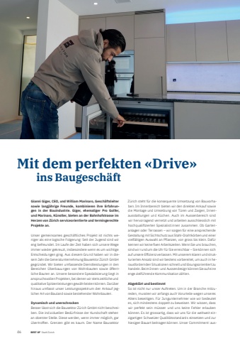 461 BEST OF BEST OF Stadt Z%u00fcrichMit dem perfekten %u00abDrive%u00bb ins Baugesch%u00e4ftGianni Giger, CEO, und William Marinaro, Gesch%u00e4ftsleiter sowie langj%u00e4hrige Freunde, kombinieren ihre Erfahrungen in der Bauindustrie. Giger, ehemaliger Pro Golfer, und Marinaro, K%u00fcnstler, bieten an der Bahnhofstrasse im Herzen von Z%u00fcrich serviceorientierte und termingerechte Projekte an.Unser gemeinsames gesch%u00e4ftliches Projekt ist nichts weniger als eine logische Folgerung: Seit der Jugend sind wir eng befreundet. Im Laufe der Zeit haben sich unsere Wege immer wieder gekreuzt, insbesondere wenn es um wichtige Entscheidungen ging. Aus diesem Grund haben wir in diesem Jahr die Generalunternehmung Bausektor Z%u00fcrich GmbH gegr%u00fcndet. Wir bieten umfassende Dienstleistungen in den Bereichen %u00dcberbauungen von Wohnbauten sowie %u00f6ffentliche Bauten an. Unsere besondere Spezialisierung liegt in anspruchsvollen Projekten, bei denen wir stets zeitliche und qualitative Spitzenleistungen gew%u00e4hrleisten k%u00f6nnen. Dar%u00fcber hinaus umfasst unser Leistungsspektrum den Ankauf jeglicher Art von Bauland sowie bestehender Wohnbauten.Dynamisch und unerschrockenBesser l%u00e4sst sich die Bausektor Z%u00fcrich GmbH nicht beschreiben. Die individuellen Bed%u00fcrfnisse der Kundschaft stehen an oberster Stelle. Diese werden, wenn immer m%u00f6glich, gar %u00fcbertroffen. Grenzen gibt es kaum. Der Name Bausektor Z%u00fcrich steht f%u00fcr die konsequente Umsetzung von Bauvorhaben. Im Innenbereich bieten wir den direkten Ankauf sowie die Montage und Umsetzung von T%u00fcren und Zargen, Innenausstattungen und K%u00fcchen. Auch im Aussenbereich sind wir hervorragend vernetzt und arbeiten ausschliesslich mit hochqualifi zierten Spezialist:innen zusammen. Ob Gartenanlagen oder Terrassen %u2013 wir sorgen f%u00fcr eine ansprechende Gestaltung mit Sichtschutz aus Stahl-Drahtk%u00f6rben und einer vielf%u00e4ltigen Auswahl an Pflanzen, von gross bis klein. Daf%u00fcr kennen wir keine fi xen Arbeitszeiten. Wenn Sie uns brauchen, sind wir rund um die Uhr f%u00fcr Sie erreichbar %u2013 Sie k%u00f6nnen sich auf unsere Effi zienz verlassen. Mit unserem klaren und strukturierten Ansatz sind wir bestens vorbereitet, um auch in herausfordernden Situationen schnell und l%u00f6sungsorientiert zu handeln. Beim Innen- und Aussendesign k%u00f6nnen Sie auf eine enge zielf%u00fchrende Kommunikation z%u00e4hlen.Abgekl%u00e4rt und bestimmtSo ist nicht nur unser Auftreten. Um in der Branche mitzureden, mussten wir anfangs auch Vorurteile wegen unseres Alters beseitigen. F%u00fcr Jungunternehmer wie wir bedeutet es, sich mindestens doppelt zu beweisen. Wir wissen, dass wir perfekt sein m%u00fcssen und uns keine Fehler erlauben k%u00f6nnen. Es ist grossartig, dass wir uns f%u00fcr die weltweit einzigartigen Schweizer Qualit%u00e4tsstandards einsetzen und zur hiesigen Bauart beitragen k%u00f6nnen. Unser Commitment: aus-