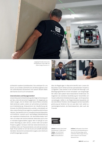 BEST OF BEST OF Stadt Z%u00fcrich 472Adresse: Bausektor Z%u00fcrich GmbHBahnhofstrasse 71, 8001 Z%u00fcrich Telefon: +41 76 370 36 67E-Mail: bausektor@mail.chWeb: www.bausektorzh.chIn K%u00fcrze: Die Bausektor Z%u00fcrich GmbH hat ihren Sitz an der Bahnhofstrasse in Z%u00fcrich. Ihr CEO Gianni Giger und Gesch%u00e4ftsleiter William Gregory Marinaro fassen sukzessive in der Schweizer Baubranche Fuss.schliesslich saubere Qualit%u00e4tsarbeit. Das verk%u00f6rpert f%u00fcr uns Z%u00fcrich, wo wir beide wohnhaft sind. Der Wirkungskreis unseres Unternehmens konzentriert sich jedoch aktuell neben dem Kanton Z%u00fcrich auch schweizweit.Unerschrocken und l%u00f6sungsorientiertUnsere fokussierte Arbeitshaltung %u00fcbertr%u00e4gt sich konsequent auf das unternehmerische Engagement. Im Gegensatz zu vielen Jungen, die mit Aktien oder Social Media schnelles Geld verdienen wollen, setzen wir auf seri%u00f6se und zeitintensive Arbeitsleistung. Entsprechend der Verpflichtung der Schweiz, bis 2050 klimaneutral zu werden, unterst%u00fctzen wir %u00fcber unsere Partnerfi rmen jegliche umweltfreundliche Massnahmen. Das betrifft nicht nur umweltschonende Materialien und Verfahren, sondern auch nachhaltige Arbeitskleidung wie rezyklierte Arbeitsschuhe. Als Gesch%u00e4ftsinhaber kommen uns neben den kommunikativen besonders auch unsere mentalen Eigenschaften zugute. Wie im Golf gilt es vom ersten Abschlag an, dem %u00abDrive%u00bb, immer mehr als hundert Prozent zu geben. Ist Gianni mehr der Unternehmerische, so ist William eher der Praxisorientierte und wirkt als kreativer Kopf. Privat widmet er sich der Kunst und schafft abstrakte Gem%u00e4lde. Das kommt uns besonders zugute, wenn die Kundschaft Einzigartiges w%u00fcnscht.Was die Regelungen im Baurecht betrifft, kann unsere GU Bausektor Z%u00fcrich GmbH auf einen spezialisierten Anwalt zur%u00fcckgreifen. Zwar werden in der Schweiz die Planungs- und Bewilligungsverfahren immer komplexer und langwieriger. Wir sehen darin jedoch keine besonderen Hindernisse. Im Gegenteil: die restriktive Handhabung der Vorschriften verhindert willk%u00fcrliche Ortsbildver%u00e4nderungen. Um Einsprachen vorzubeugen, helfen in der Regel kl%u00e4rende Gespr%u00e4che mit den betroffenen Parteien. Die Anfangszeit seit der Gesch%u00e4ftsgr%u00fcndung war fordernd, hat uns zwei aber noch weiter zusammengeschweisst, als Businesspartner, aber auch als Freunde.Langj%u00e4hrige Freunde und neu auch Gesch%u00e4ftspartner: Gianni Giger und William Gregory Marinaro (v. l.)