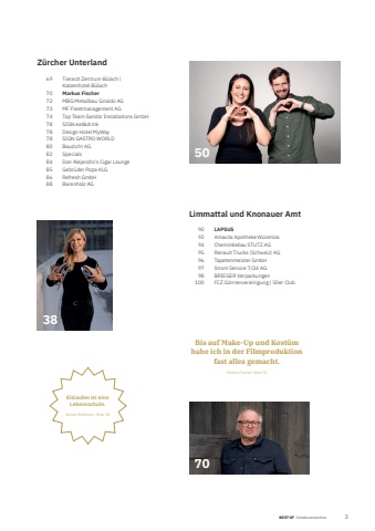 BEST OF Inhaltsverzeichnis 3Z%u00fcrcher Unterland69 Tierarzt Zentrum B%u00fclach | Katzenhotel B%u00fclach70 Markus Fischer72 MBG Metallbau Giraldo AG73 MF Fleetmanagement AG74 Top Team Sanit%u00e4r Installations GmbH78 SIGN eat&drink78 Design Hotel MyWay78 SIGN GASTRO WORLD80 Baudicht AG82 Specials84 Don Alejandro%u2019s Cigar Lounge85 Gebr%u00fcder Popa KLG86 Refresh GmbH88 Barenholz AG50Bis auf Make-Up und Kost%u00fcm habe ich in der Filmproduktion fast alles gemacht.Markus Fischer, Seite 707038Limmattal und Knonauer Amt90 LAPSUS92 Amavita Apotheke W%u00fcrenlos94 Chemin%u00e9ebau STUTZ AG95 Renault Trucks (Schweiz) AG96 Tapetenmeister GmbH97 Strom Service 7/24 AG98 BRIEGER Verpackungen100 FCZ G%u00f6nnervereinigung | 50er ClubEislaufen ist eine Lebensschule.Denise Biellmann, Seite 38