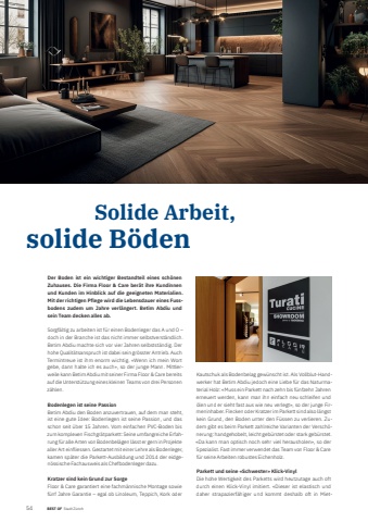 541 BEST OF BEST OF Stadt Z%u00fcrich Solide Arbeit, solide B%u00f6denDer Boden ist ein wichtiger Bestandteil eines sch%u00f6nen Zuhauses. Die Firma Floor & Care ber%u00e4t ihre Kundinnen und Kunden im Hinblick auf die geeigneten Materialien. Mit der richtigen Pflege wird die Lebensdauer eines Fussbodens zudem um Jahre verl%u00e4ngert. Betim Abdiu und sein Team decken alles ab.Sorgf%u00e4ltig zu arbeiten ist f%u00fcr einen Bodenleger das A und O %u2013 doch in der Branche ist das nicht immer selbstverst%u00e4ndlich. Betim Abdiu machte sich vor vier Jahren selbstst%u00e4ndig. Der hohe Qualit%u00e4tsanspruch ist dabei sein gr%u00f6sster Antrieb. Auch Termintreue ist ihm enorm wichtig. %u00abWenn ich mein Wort gebe, dann halte ich es auch%u00bb, so der junge Mann. Mittlerweile kann Betim Abdiu mit seiner Firma Floor & Care bereits auf die Unterst%u00fctzung eines kleinen Teams von drei Personen z%u00e4hlen. Bodenlegen ist seine Passion Betim Abdiu den Boden anzuvertrauen, auf dem man steht, ist eine gute Idee: Bodenlegen ist seine Passion, und das schon seit %u00fcber 15 Jahren. Vom einfachen PVC-Boden bis zum komplexen Fischgr%u00e4tparkett: Seine umfangreiche Erfahrung f%u00fcr alle Arten von Bodenbel%u00e4gen l%u00e4sst er gern in Projekte aller Art einfliessen. Gestartet mit einer Lehre als Bodenleger, kamen sp%u00e4ter die Parkett-Ausbildung und 2014 der eidgen%u00f6ssische Fachausweis als Chefbodenleger dazu. Kratzer sind kein Grund zur SorgeFloor & Care garantiert eine fachm%u00e4nnische Montage sowie f%u00fcnf Jahre Garantie %u2013 egal ob Linoleum, Teppich, Kork oder Kautschuk als Bodenbelag gew%u00fcnscht ist. Als Vollblut-Handwerker hat Betim Abdiu jedoch eine Liebe f%u00fcr das Naturmaterial Holz: %u00abMuss ein Parkett nach zehn bis f%u00fcnfzehn Jahren erneuert werden, kann man ihn einfach neu schleifen und %u00f6len und er sieht fast aus wie neu verlegt%u00bb, so der junge Firmeninhaber. Flecken oder Kratzer im Parkett sind also l%u00e4ngst kein Grund, den Boden unter den F%u00fcssen zu verlieren. Zudem gibt es beim Parkett zahlreiche Varianten der Versch%u00f6nerung: handgehobelt, leicht geb%u00fcrstet oder stark geb%u00fcrstet. %u00abDa kann man optisch noch sehr viel herausholen%u00bb, so der Spezialist. Fast immer verwendet das Team von Floor & Care f%u00fcr seine Arbeiten robustes Eichenholz.Parkett und seine %u00abSchwester%u00bb Klick-VinylDie hohe Wertigkeit des Parketts wird heutzutage auch oft durch einen Klick-Vinyl imitiert. %u00abDieser ist elastisch und daher strapazierf%u00e4higer und kommt deshalb oft in Miet-
