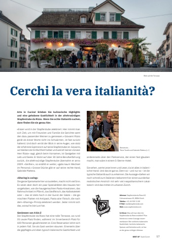BEST OF BEST OF Stadt Z%u00fcrich Portrait xxx 572Adresse: Stapferstube da Rizzo AGCulmannstrasse 45, 8006 Z%u00fcrichTelefon: +41 44 350 11 00E-Mail: mail@stapferstube.comWeb: www.stapferstube.comIn K%u00fcrze: Was will man %u00fcber die Stapferstube da Rizzo erz%u00e4hlen? Man k%u00f6nnte es in einer Aussage zusammenfassen: Wer wirkliche italienische Gastlichkeit, herrliche italienische Speisen und Getr%u00e4nke sucht, ist hier an der genau richtigen Adresse. Arte in Cucina! Erleben Sie kulinarische Highlights und eine gehobene Gastlichkeit in der altehrw%u00fcrdigen Stapferstube da Rizzo. Wenn Sie echte Italianit%u00e0 suchen, dann fi nden Sie sie genau hier.%u00abEssen wird in der Stapferstube zelebriert. Hier nimmt man sich Zeit, um mit Freunden und Familie die Gerichte samt den dazu passenden Weinen zu geniessen.%u00bb Giovanni Rizzo ger%u00e4t ob dieser Worte nicht ins Schw%u00e4rmen, ist fast zur%u00fcckhaltend. Und doch verr%u00e4t der Blick in seine Augen, wie stolz der erfahrene Gastronom auf seine Stapferstube ist. Giovanni, wir bleiben der Einfachheit halber und weil eh keiner %u00abGr%u00fcezi Herr Rizzo%u00bb sagt, gleich beim Vornamen, ist Gastgeber mit Leib und Seele. Er blickt auf %u00fcber 30 Jahre Berufserfahrung zur%u00fcck, die altehrw%u00fcrdige Stapferstube %u00fcbernahm er anno 2009. %u00abSeither%u00bb, so erz%u00e4hlt er weiter, %u00abgabs kaum Wechsel im Personal.%u00bb Grosse St%u00fccke gibt er auf seine rechte Hand, Gabriele Mattera. %u00abSharing is caring%u00bbDie ganze Speisekarte hier vorzustellen, macht nicht viel Sinn. Es seien aber doch ein paar Spezialit%u00e4ten des Hauses hervorgehoben, wie die hausgemachten Pasta-Kreationen, das Rahmschnitzel im Pf%u00e4nnli, das Siedfleisch, das Kalbskotelett oder %u2013 das ist stets hoch in der Gunst der G%u00e4ste %u2013 die gemischten Platten mit Antipasti, Pasta oder Fleisch, die nach dem %u00abSharing%u00bb-Prinzip zelebriert werden. Jeder nimmt sich das, worauf er/sie Lust hat.Geniessen von A bis ZDie Stapferstube da Rizzo hat eine tolle Terrasse, wo rund 35 Leute Platz fi nden, w%u00e4hrend im Innenbereich Platz f%u00fcr 100 Personen gew%u00e4hrleistet ist. Eine Reservation lohnt sich in jedem Fall. Sie als Gast werden staunen. Einerseits %u00fcber die gepflegte und eben typisch italienische Gastlichkeit und Cerchi la vera italianit%u00e0?andererseits %u00fcber den Parkservice, der einen fast glauben macht, man w%u00e4re in einem 5-Sterne-Hotel. Sie sehen, werte Leserinnen und Leser, da ist alles in italienischer Hand. Und das ist gut so. Denn so %u2013 und nur so %u2013 ist die typische Italianit%u00e0 auch zu erkennen. Die Aussage %u00abGehen wir noch schnell zum Italiener%u00bb bekommt hier einen wunderbar realistischen Anstrich mit sehr viel neapolitanischem Lokalkolorit. Und das mitten im urbanen Z%u00fcrich.Blick auf die TerrasseBenvenuto %u2026 Mario Tarallo und Gabriele Mattera (v. l.)