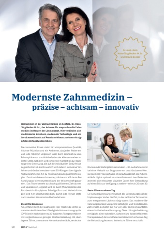 581 BEST OF BEST OF Stadt Z%u00fcrich Portrait xxxWillkommen in der Zahnarztpraxis im Seefeld, Dr.%u00a0HansJ%u00f6rg Becker M. Sc., der Adresse f%u00fcr anspruchsvolle Zahnmedizin im Herzen der Limmatstadt. Hier verbinden sich medizinische Exzellenz, modernste Technologie und ein Serviceverst%u00e4ndnis auf Premium-Niveau zu einem einzigartigen Behandlungserlebnis. Die innovative Praxis steht f%u00fcr kompromisslose Qualit%u00e4t, h%u00f6chste Pr%u00e4zision und ein Ambiente, das jeden Patienten und jede Patientin vergessen l%u00e4sst, beim Zahnarzt zu sein. Privatsph%u00e4re und das Wohlbefi nden der Klienten stehen an erster Stelle. Geboten wird vom ersten Kontakt bis zur Nachsorge eine Betreuung, die auf die individuellen Bed%u00fcrfnisse zugeschnitten ist. Kontinuierlich wird dabei in innovative Verfahren und Ger%u00e4te investiert %u2013 vom 3D-R%u00f6ntgen %u00fcber digitale Abdrucknahme bis hin zu minimalinvasiven Lasertechnologien. Damit wird eine schonende, pr%u00e4zise und effi ziente Behandlung auf dem neuesten Stand der Wissenschaft garantiert. Das Team besteht aus hochqualifi zierten Zahn%u00e4rzten und Spezialisten, erg%u00e4nzt wird es durch Mitarbeitende des Fachbereichs Prophylaxe. St%u00e4ndige Fort- und Weiterbildungen sind hier selbstverst%u00e4ndlich, damit jede Person stets nach neustem Wissensstand behandelt wird. Die dritte DimensionAm Anfang steht die Diagnostik: Hier macht die dritte Dimension den Unterschied. Die digitale Volumentomographie (DVT) ist ein hochmodernes 3D-basiertes R%u00f6ntgenverfahren mit vergleichsweise geringer Strahlenbelastung. Ob %u00fcberlagerte Z%u00e4hne, unerwartete Nervenkanalverl%u00e4ufe, verdeckte Wurzeln oder Kiefergelenksanomalien %u2013 3D-Aufnahmen sind bei einer Vielzahl von Diagnosen von unsch%u00e4tzbarem Wert. Die spezielle Praxissoftware ist darauf ausgelegt, alle Arbeitsabl%u00e4ufe digital optimal zu unterst%u00fctzen und den Patienten jederzeit alle relevanten visuellen Daten ihrer Behandlung auf einen Blick zur Verf%u00fcgung zu stellen %u2013 sei es in 2D oder 3D.Feste Z%u00e4hne an einem TagEin Schwerpunkt auf dem Gebiet der Behandlungen ist die Implantologie. Vorbei die Zeit, in der zahlreiche Termine bis zum entspannten L%u00e4cheln n%u00f6tig waren: Das moderne Behandlungskonzept verspricht sofortigen und festsitzenden Zahnersatz. Es bietet auf nur vier oder sechs Implantaten eine sofort belastbare Versorgung. Diese chirurgische L%u00f6sung erm%u00f6glicht einen schnellen, sicheren und kosteneffi zienten Therapieablauf, der dem Patienten tats%u00e4chlich schon am Tag der Behandlung feste und %u00e4sthetische Z%u00e4hne verschafft.Modernste Zahnmedizin %u2013 pr%u00e4zise %u2013 achtsam %u2013 innovativ Dr. med. dent. Hans-J%u00f6rg Becker M. Sc. und Ursula Becker